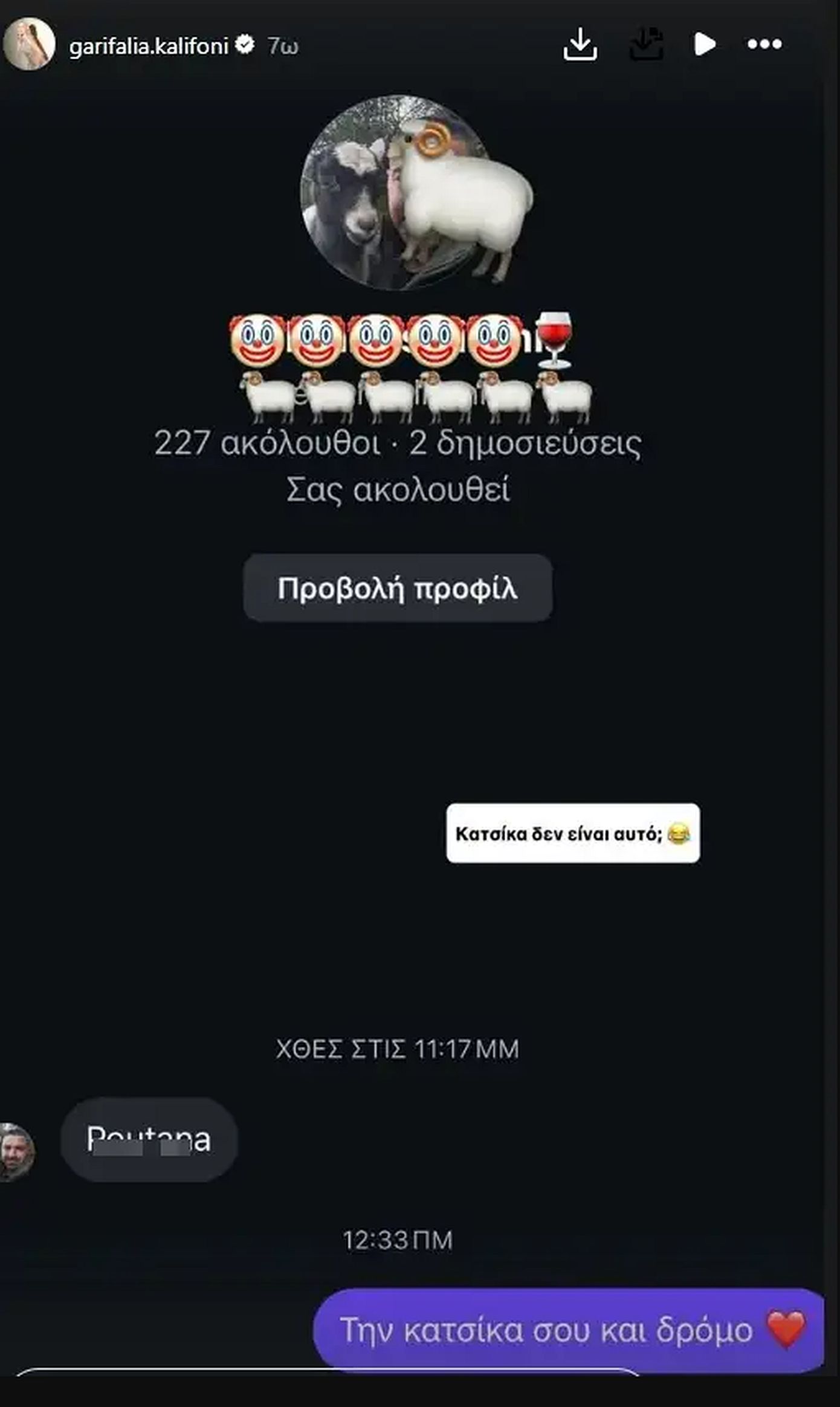Αυτή τη φορά, η Γαρυφαλλιά Καληφώνη έλαβε ένα μήνυμα που έγραφε, «π@@@@να». Το μήνυμα αυτό την έκανε έξαλλη γι’ αυτό και αποφάσισε να το κοινοποιήσει στους ακόλουθούς της μαζί με τη δική της απάντηση που έγραφε: «Την κατσίκα σου και δρόμο».