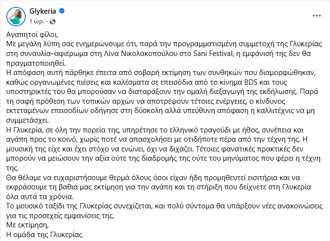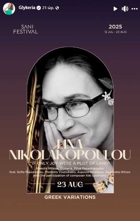 Με μεγάλη λύπη σας ενημερώνουμε ότι, παρά την προγραμματισμένη συμμετοχή της Γλυκερίας στη συναυλία–αφιέρωμα στη Λίνα Νικολακοπούλου στο Sani Festival, η εμφάνισή της δεν θα πραγματοποιηθεί.