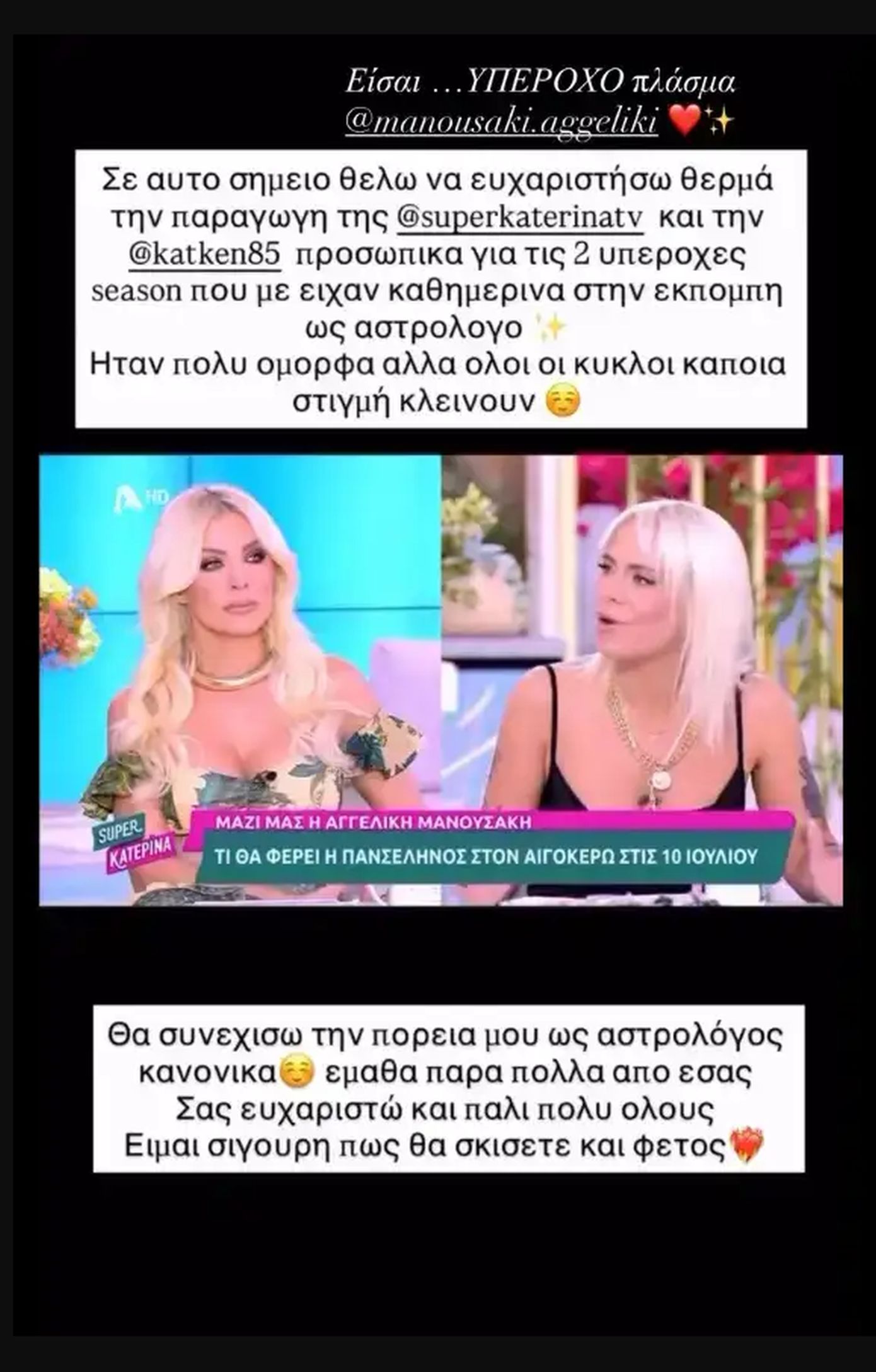 «Σε αυτό το σημείο θέλω να ευχαριστήσω θερμά την παραγωγή της @superkaterinatv και την @katken85 προσωπικά για τις 2 υπέροχες σεζόν που με είχαν καθημερινά στην εκπομπή ως αστρολόγο. Ήταν πολύ όμορφα, αλλά όλοι οι κύκλοι κάποια στιγμή κλείνουν. Θα συνεχίσω την πορεία μου ως αστρολόγος κανονικά. Έμαθα πάρα πολλά από εσάς. Σας ευχαριστώ και πάλι πολύ όλους. Είμαι σίγουρη πως θα σκίσετε και φέτος», έγραψε χαρακτηριστικά η Αγγελική Μανουσάκη.