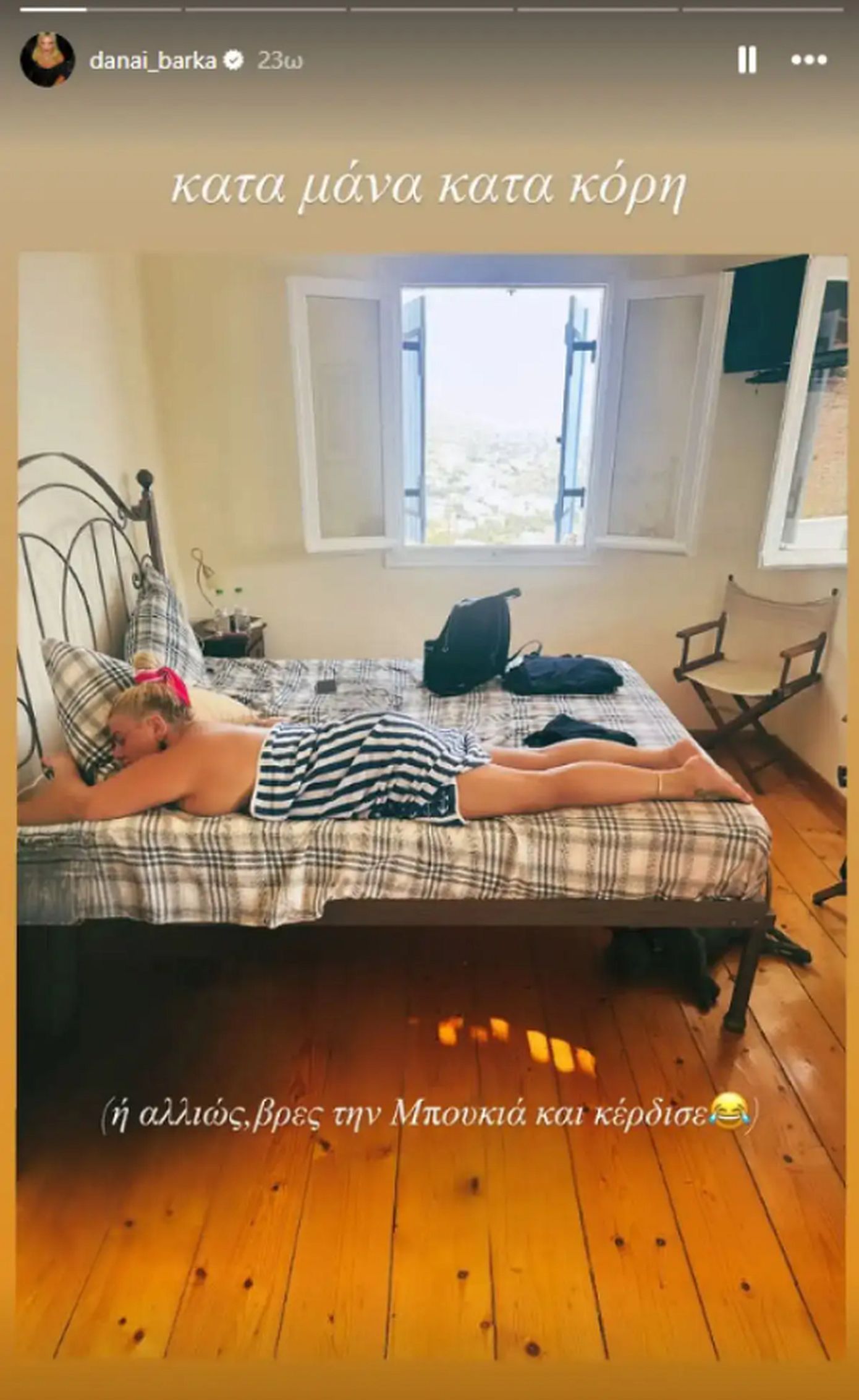 Η Δανάη Μπάρκα ήταν ξαπλωμένη στο κρεβάτι της, τόπλες, με μία πετσέτα στο σώμα της. Κάτω από το κρεβάτι είχε ξαπλώσει και η σκυλίτσα της, η Μπουκιά, με την ίδια να σχολιάζει πως συμπεριφέρεται όπως εκείνη.
