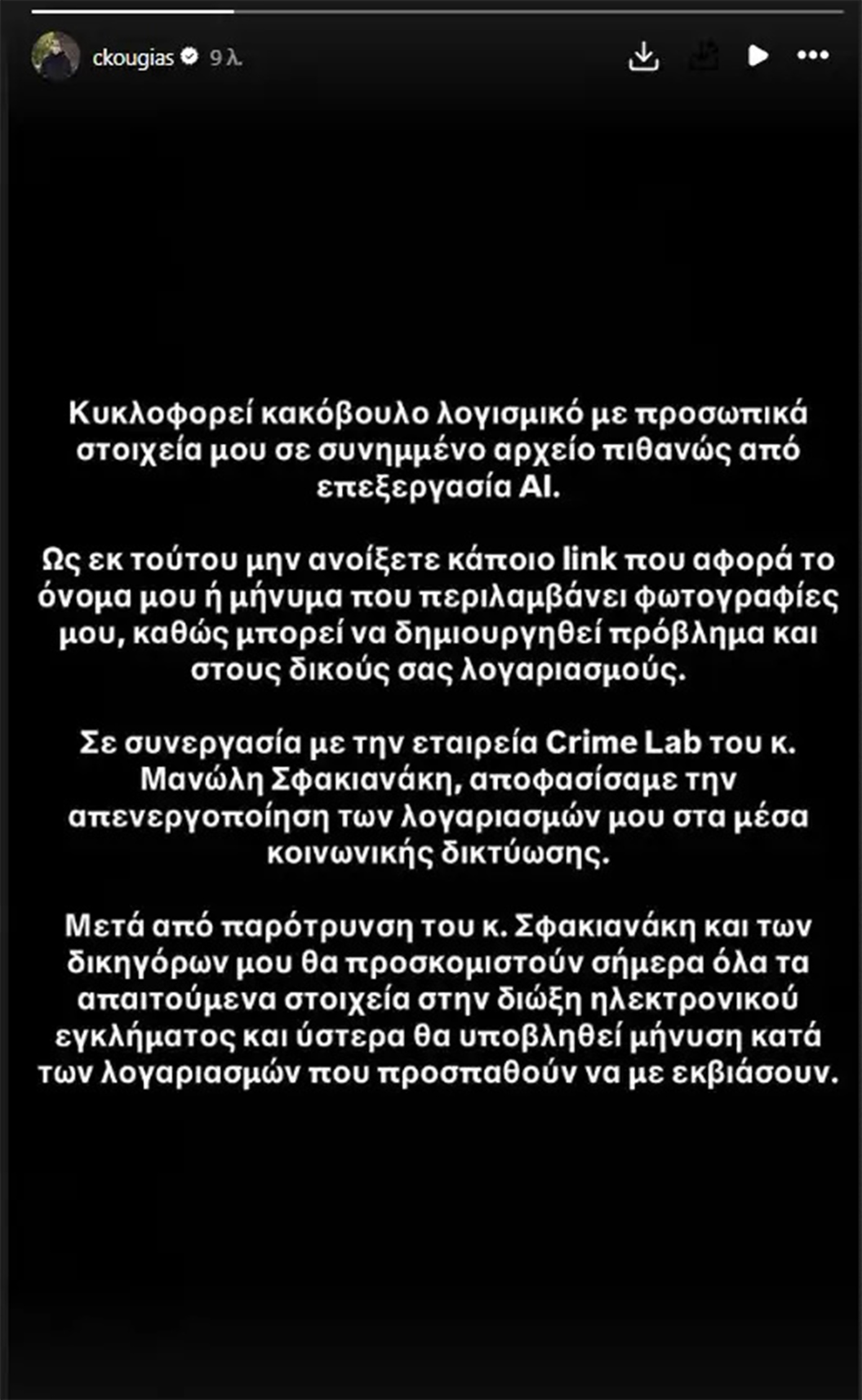 «Κυκλοφορεί κακόβουλο λογισμικό με προσωπικά στοιχεία μου σε συνημμένο αρχείο πιθανώς από επεξεργασία AI. Ως εκ τούτου, μην ανοίξετε κάποιο link που αφορά το όνομά μου ή μήνυμα που περιλαμβάνει φωτογραφίες μου, καθώς μπορεί να δημιουργηθεί πρόβλημα και στους δικούς σας λογαριασμούς.