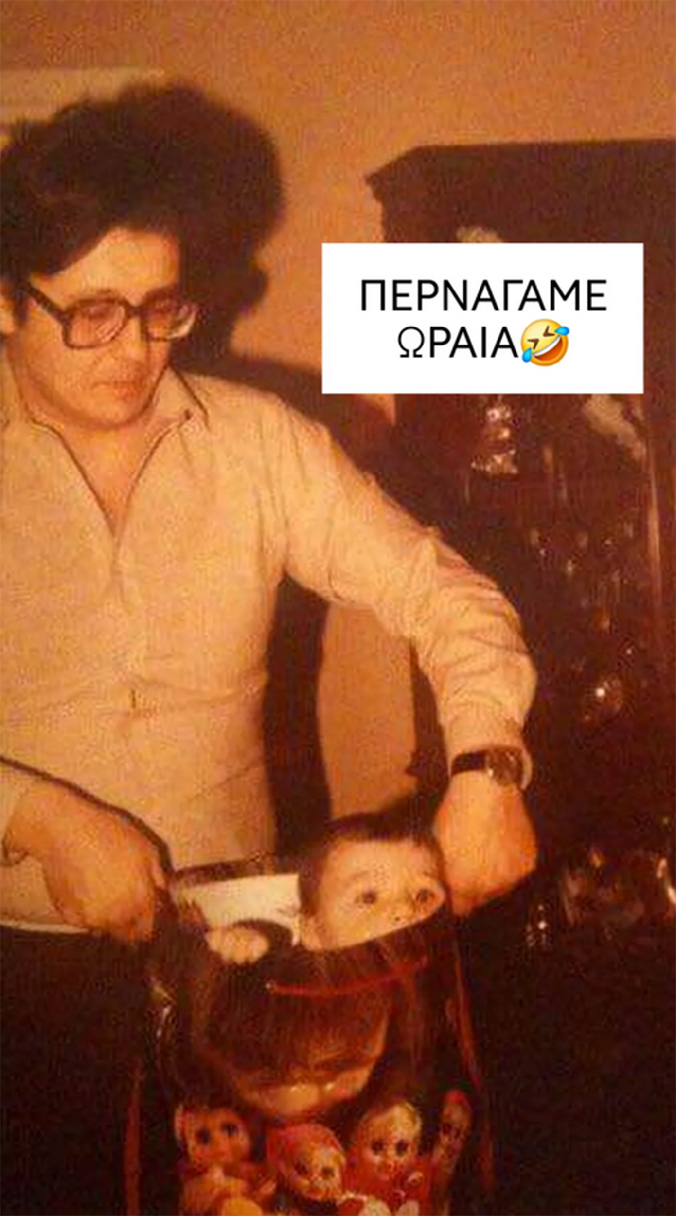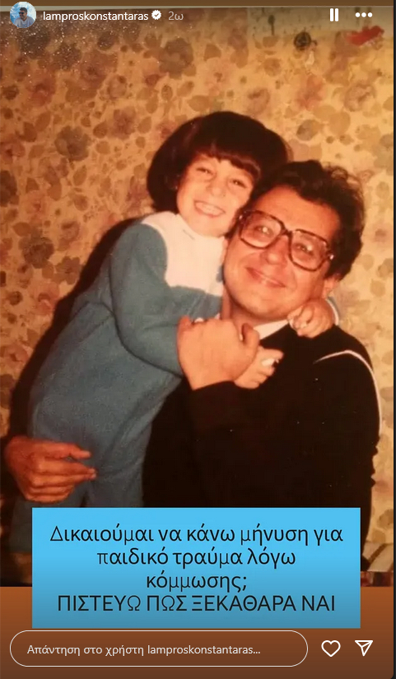 «Δικαιούμαι να κάνω μήνυση για παιδικό τραύμα λόγω κόμμωσης; Πιστεύω πως ξεκάθαρα ναι» έγραψε στη δεύτερη φωτογραφία, που είναι στην αγκαλιά του Δημήτρη Κωνσταντάρα.