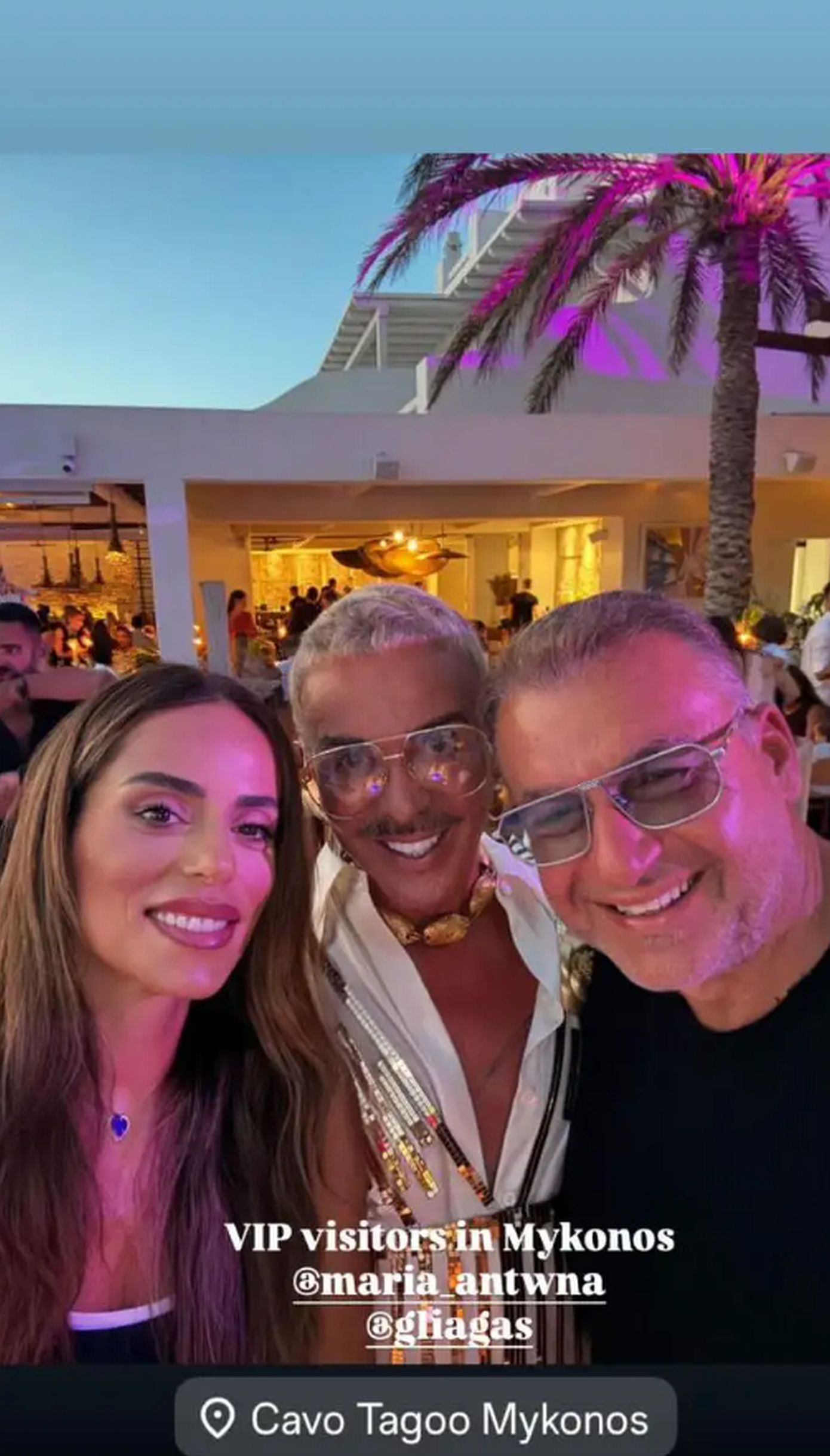 Το βράδυ του Σαββάτου, 30 Αυγούστου, το ζευγάρι απαθανατίστηκε μαζί με τον Λάκη Γαβαλά, ο οποίος μοιράστηκε τη συντροφιά τους, ενώ η Μαρία Αντωνά δε δίστασε να αναδημοσιεύσει το στιγμιότυπο στο Instagram.