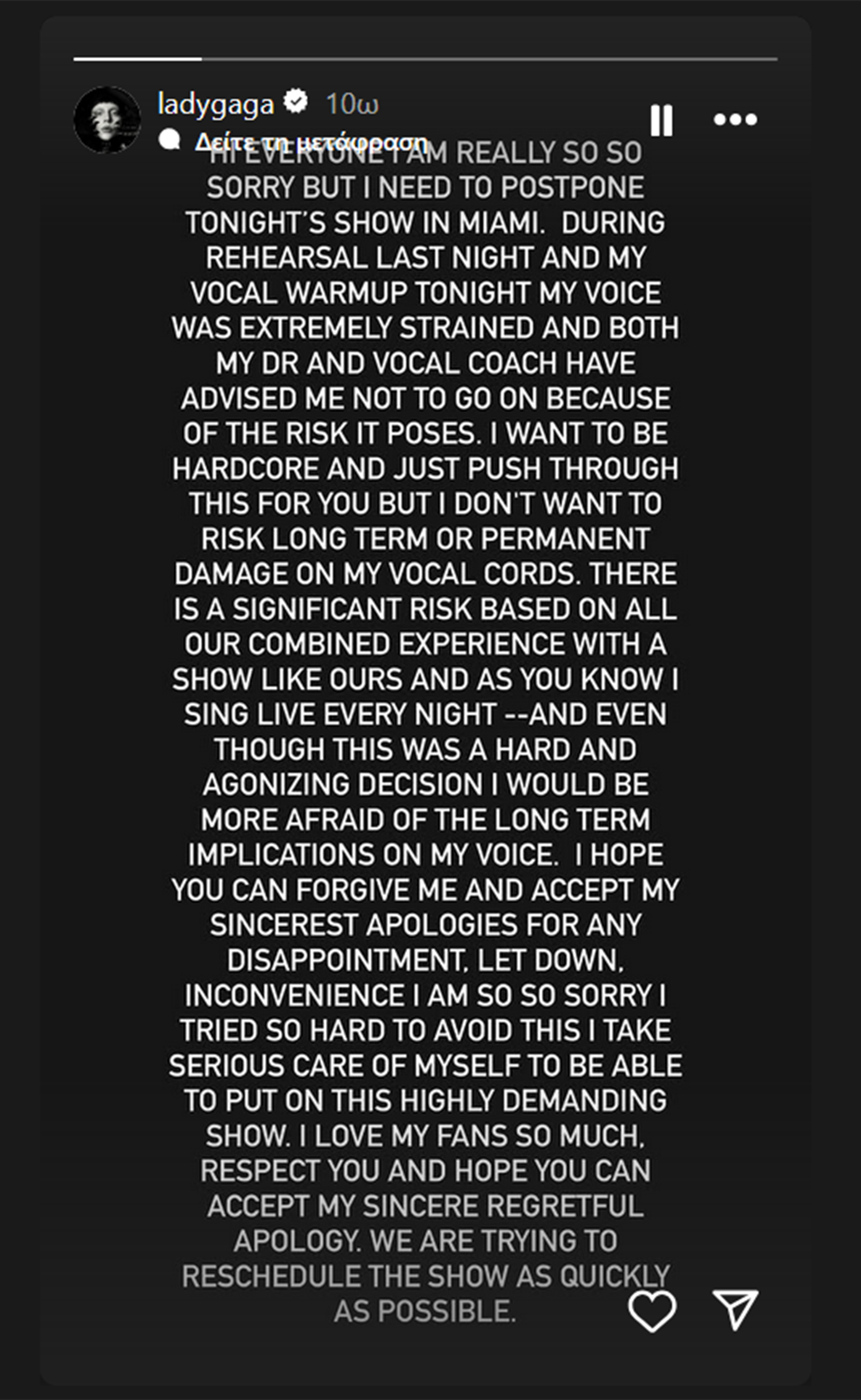 Η Lady Gaga, ανέβαλε την πολυαναμενόμενη συναυλία της στο Kaseya Center του Μαϊάμι, λίγα μόλις λεπτά πριν την έναρξή της, λόγω σοβαρού προβλήματος στις φωνητικές χορδές της.