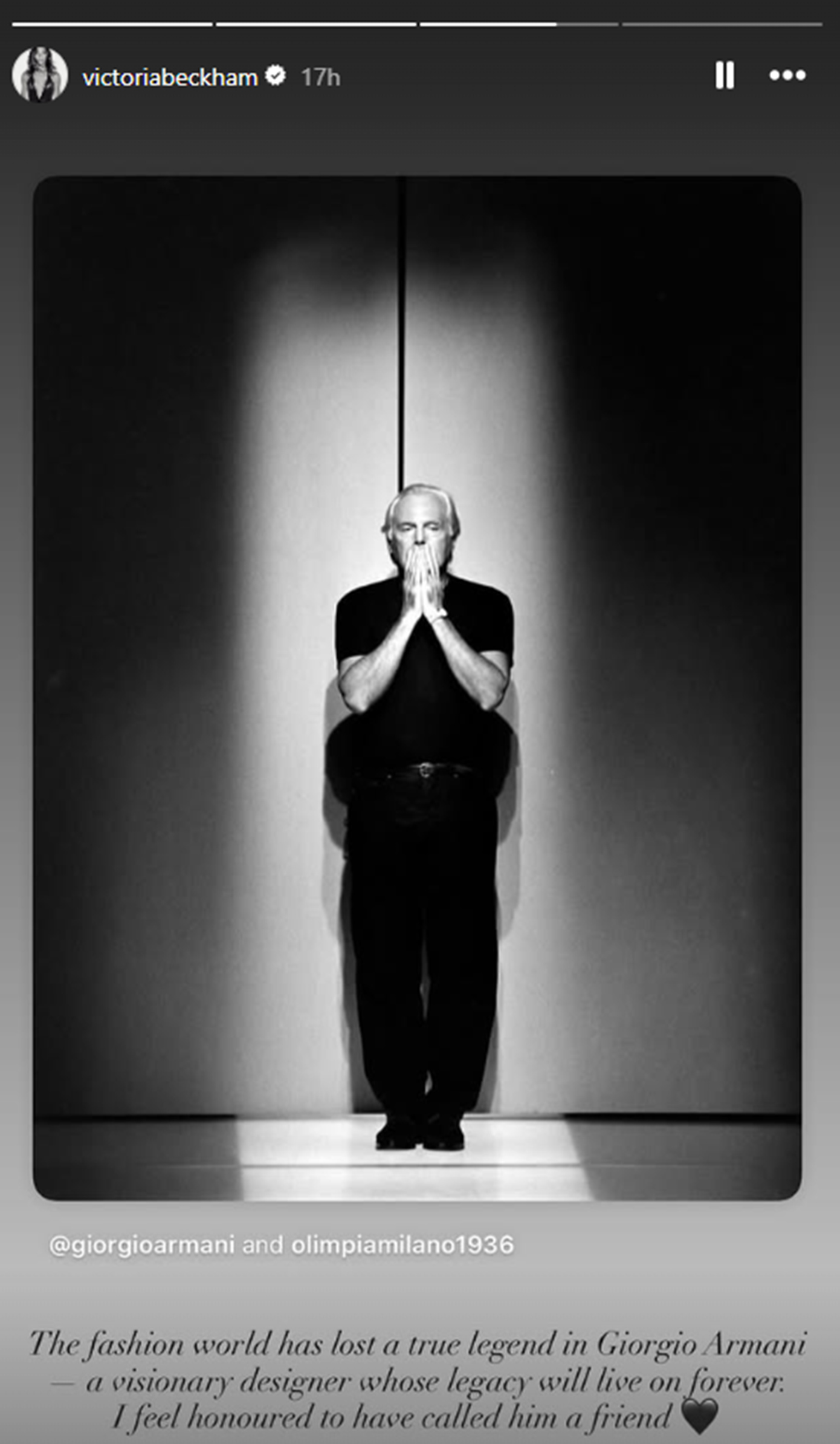 Στη συνέχεια, η σχεδιάστρια και πρώην μέλος των Spice Girls, Βικτόρια Μπέκαμ, έγραψε στον προσωπικό της λογαριασμό στο Instagram: «Ο κόσμος της μόδας έχασε έναν πραγματικό θρύλο, τον Τζόρτζιο Αρμάνι – έναν οραματιστή σχεδιαστή, η κληρονομιά του οποίου θα ζει για πάντα. Νιώθω τιμή που τον αποκαλούσα φίλο μου».