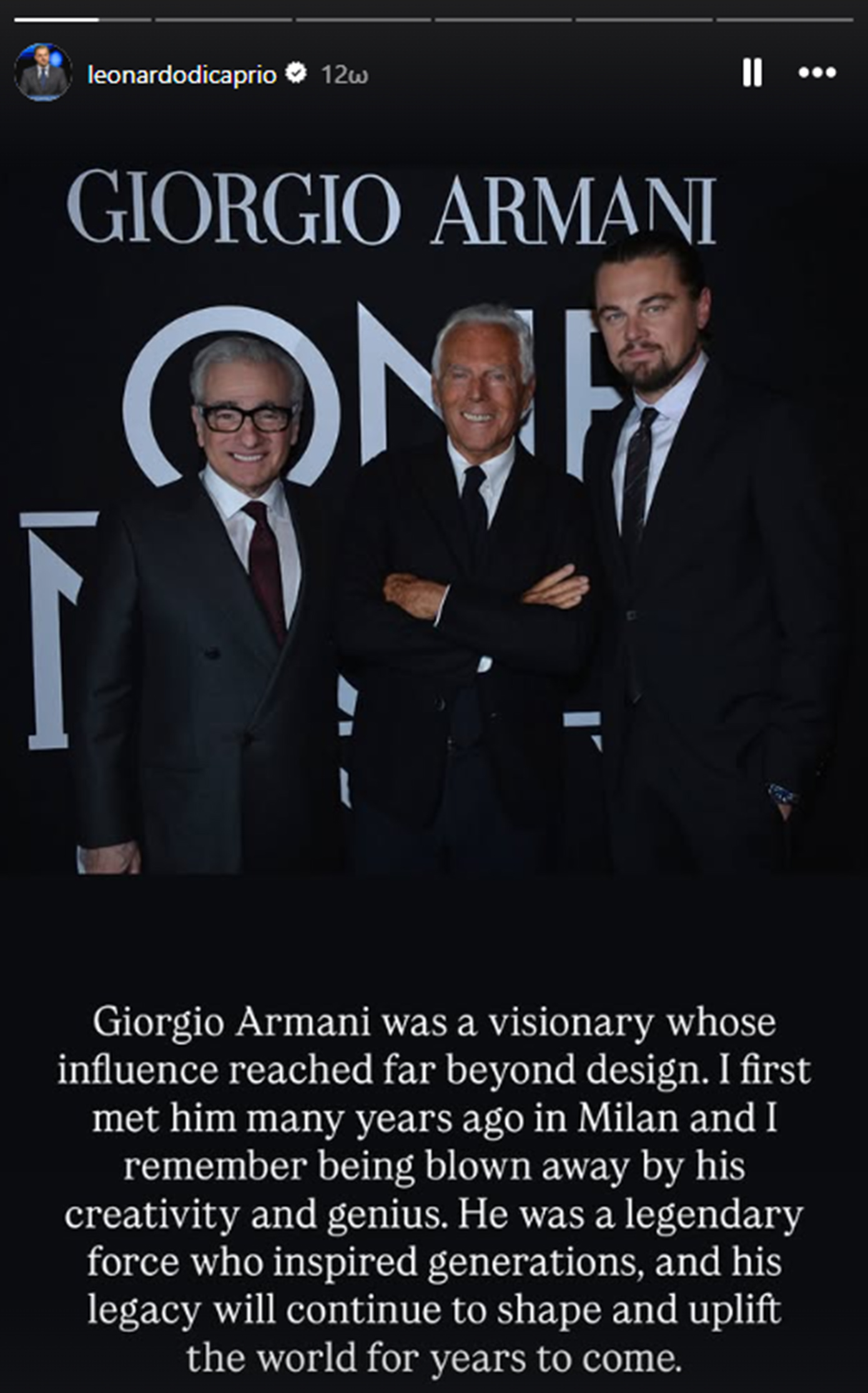 Ο ηθοποιός, Λεονάρντο Ντι Κάπριο, μοιράστηκε στο Instagram Story του ένα κοινό στιγμιότυπο από το παρελθόν, στο οποίο είναι μαζί και ο σκηνοθέτης Μάρτιν Σκορσέζε, συνοδεύοντάς το με λόγια συγκίνησης: «Ο Τζόρτζιο Αρμάνι ήταν ένας οραματιστής, η επιρροή του οποίου ξεπερνούσε κατά πολύ τον χώρο του ντιζάιν», έγραψε.