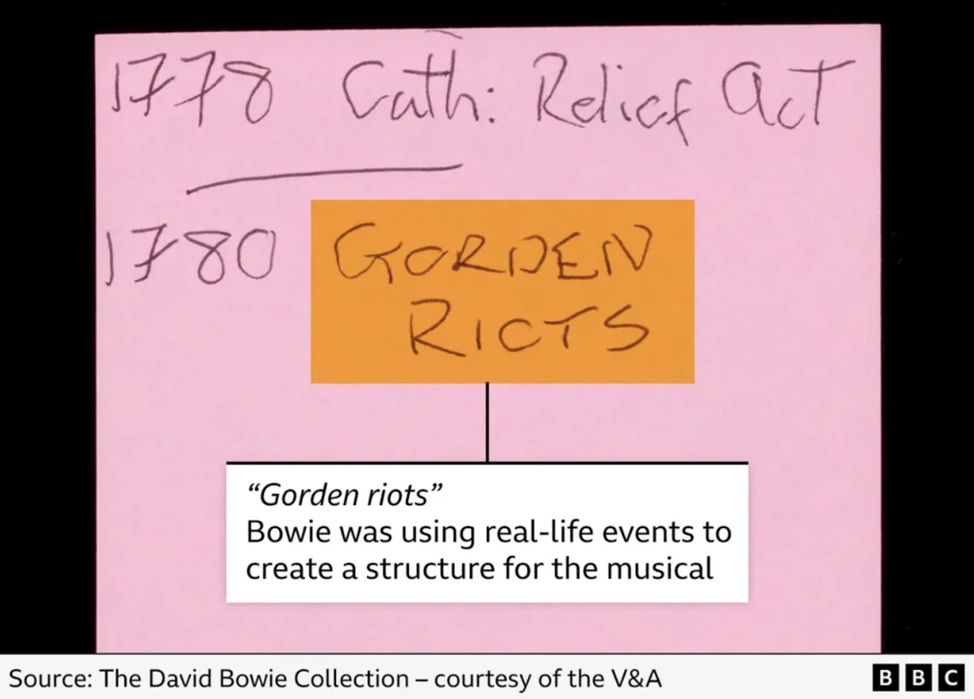 Σε ευρύτερο επίπεδο, ο Μπόουι κατασκεύασε ένα χρονολόγιο του πρώιμου 18ου αιώνα, μελετώντας ζωγράφους όπως οι Τζόσουα Ρέινολντς και Ουίλιαμ Χόγκαρθ και τη δημιουργία της Βασιλικής Ακαδημίας. «Ενδιαφερόταν για την ανάπτυξη των μιούζικαλ εκείνη την περίοδο στο Λονδίνο και για το πώς χρησιμοποιούνταν για πολιτική σάτιρα, ιδιαίτερα κατά της κυβέρνησης του Ρόμπερτ Γουόλπολ», λέει η Χάντον. «Φαίνεται ότι αναρωτιόταν: “Ποιος είναι ο ρόλος των καλλιτεχνών σε αυτή την εποχή; Πώς δημιουργούν μια σατιρική κριτική;”».