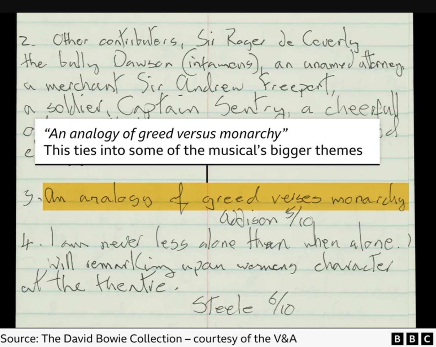 Αποκλειστικά στο BBC, οι σημειώσεις αποκαλύπτουν το ενδιαφέρον του Μπόουι για την ανάπτυξη της τέχνης και του σατιρικού λόγου στο Λονδίνο του 18ου αιώνα, παράλληλα με ιστορίες εγκληματικών συμμοριών και τον διαβόητο κλέφτη «Honest» Τζακ Σέπαρντ. Αν είχε ολοκληρωθεί, το μιούζικαλ θα υλοποιούσε ένα από τα όνειρα του Μπόουι. «Από την αρχή, ήθελα πραγματικά να γράψω για το θέατρο», είπε στο BBC Radio 4 στον Τζον Γουίλσον το 2002. «Και φαντάζομαι ότι θα μπορούσα απλώς να έγραφα για θέατρο στο σαλόνι μου, αλλά νομίζω ότι η πρόθεση ήταν πάντα να φτάσει στο ευρύ κοινό», συμπλήρωνε.