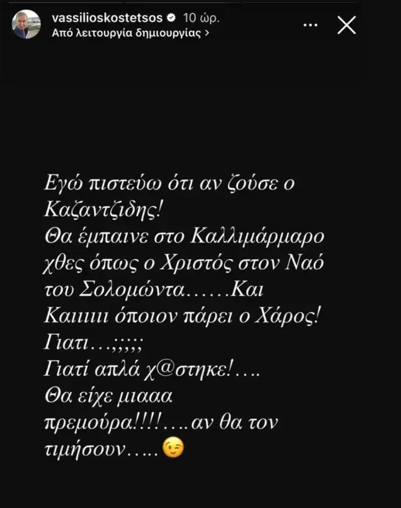 «Εγώ πιστεύω ότι αν ζούσε ο Καζαντζίδης θα έμπαινε στο Καλλιμάρμαρο χθες όπως ο Χριστός στον ναό του Σολομώντα… Και όποιον πάρει ο χάρος! Γιατί; Γιατί απλά χ..στηκε! Θα είχε μία πρεμούρα αν θα τον τιμήσουν…!!!», έγραψε ο Βασίλειος Κωστέτσος.