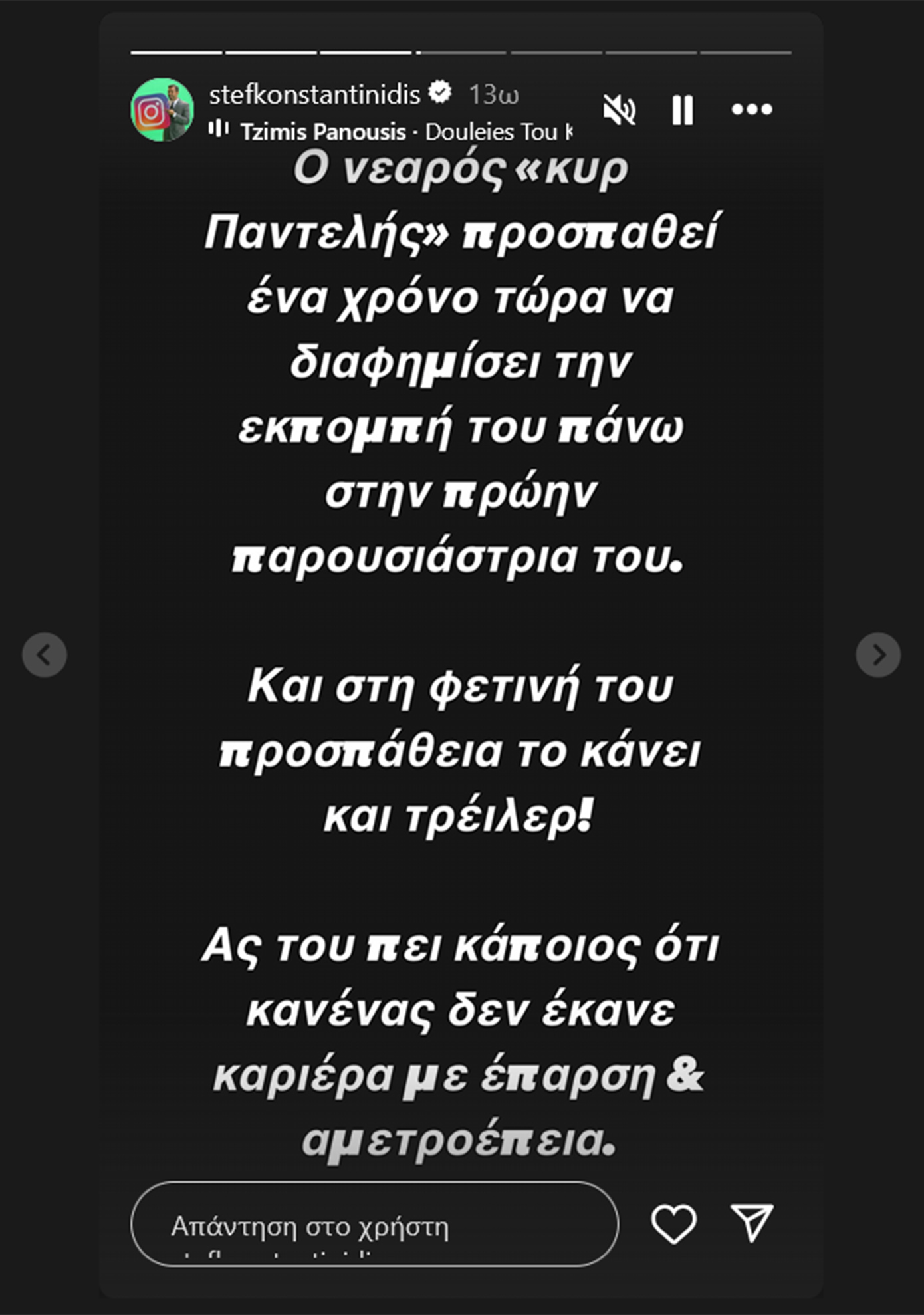 «Ο νεαρός “Κυρ Παντελής” προσπαθεί έναν χρόνο τώρα να διαφημίσει την εκπομπή του πάνω σε πρώην παρουσιάστριά του. Και στη φετινή του προσπάθεια το κάνει και trailer. Ας του πει κάποιος ότι κανένας δεν έκανε καριέρα με έπαρση και αμετροέπεια», έγραψε ο Στέφανος Κωνσταντινίδης.