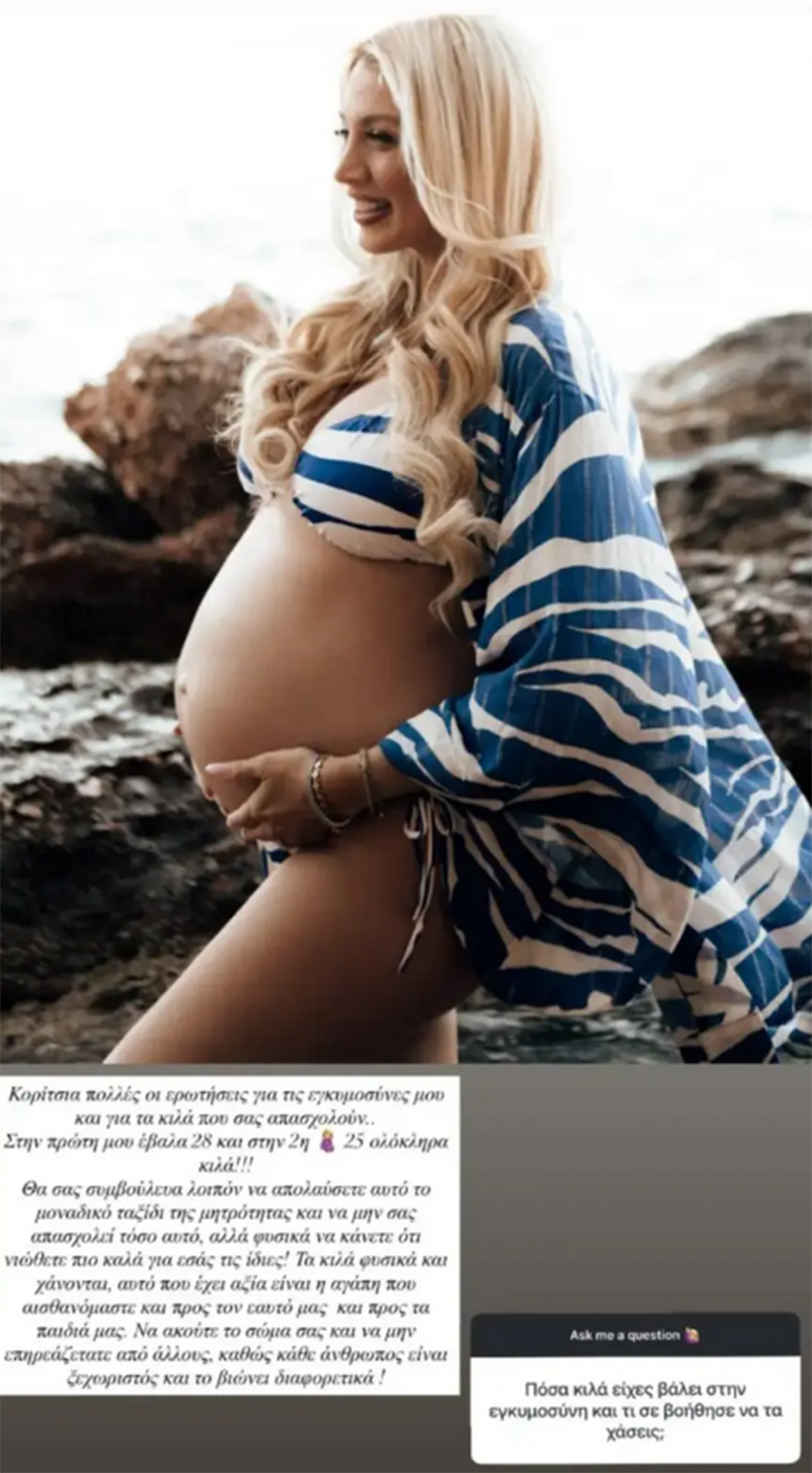 Μεταξύ άλλων, η παρουσιάστρια δέχτηκε μια πολύ συχνή ερώτηση που απασχολεί τις γυναίκες: τα κιλά που πήρε στις εγκυμοσύνες της. Με απόλυτη ειλικρίνεια, αποκάλυψε πως στην πρώτη κύηση πήρε 28 κιλά, ενώ στη δεύτερη 25.