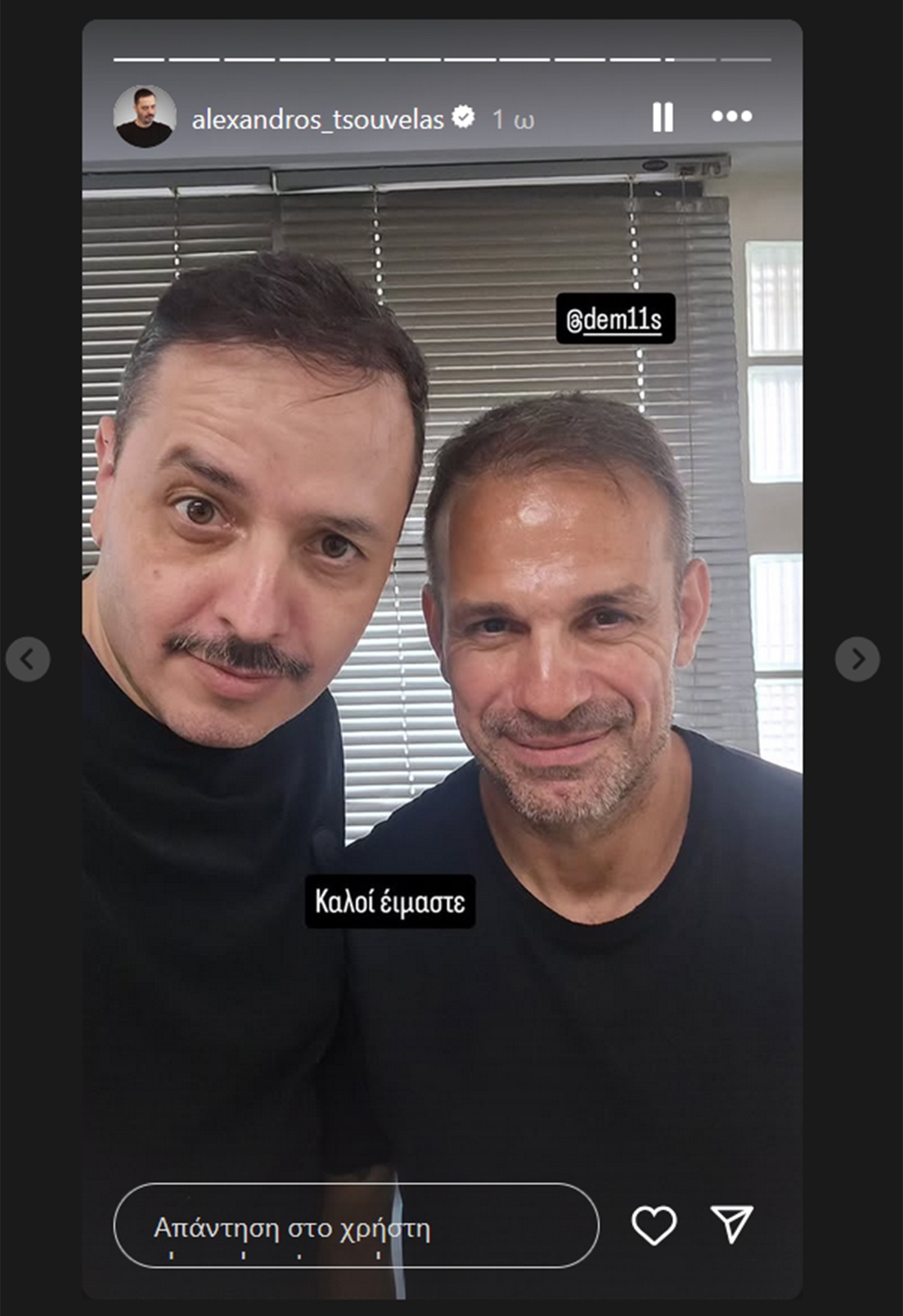 Παράλληλα, ο Αλέξανδρος Τσουβέλας δημοσίευσε ένα story στο Instagram, όπου ποζάρει δίπλα στον Ντέμη Νικολαΐδη, σημειώνοντας πάνω στη φωτογραφία «Καλοί είμαστε».