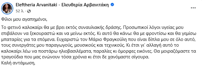 «Το φετινό καλοκαίρι θα με βρει εκτός συναυλιακής δράσης. Προσωπικοί λόγοι υγείας μου επιβάλλουν να ξεκουραστώ και να μείνω εκτός.