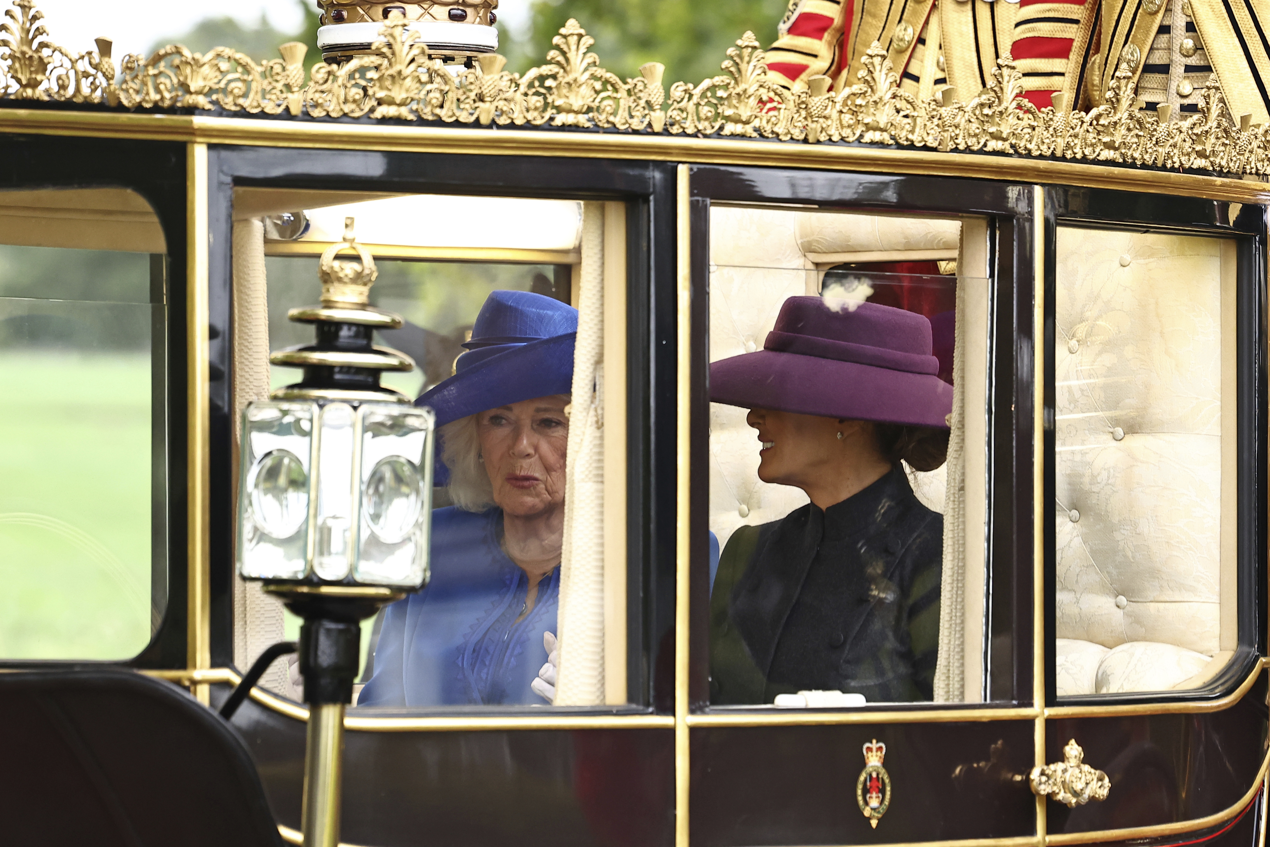 Για να σπάσει τον μονόχρωμο τόνο του συνόλου, η Πρώτη Κυρία φόρεσε ένα έντονο βιολετί καπέλο με φαρδύ γείσο. Το χρώμα του καπέλου, το οποίο ήταν κατασκευασμένο από μαλλί, δεν ήταν τυχαίο. Το βιολετί χρώμα έχει ιστορική σύνδεση με τη βασιλεία και την πολυτέλεια, καθώς η παραγωγή του ήταν εξαιρετικά δαπανηρή και ήταν προσβάσιμο μόνο στις ανώτερες κοινωνικές τάξεις. Η επιλογή αυτή ήταν ένα ξεκάθαρο «νεύμα» προς τη βασιλική οικογένεια που την υποδέχθηκε.