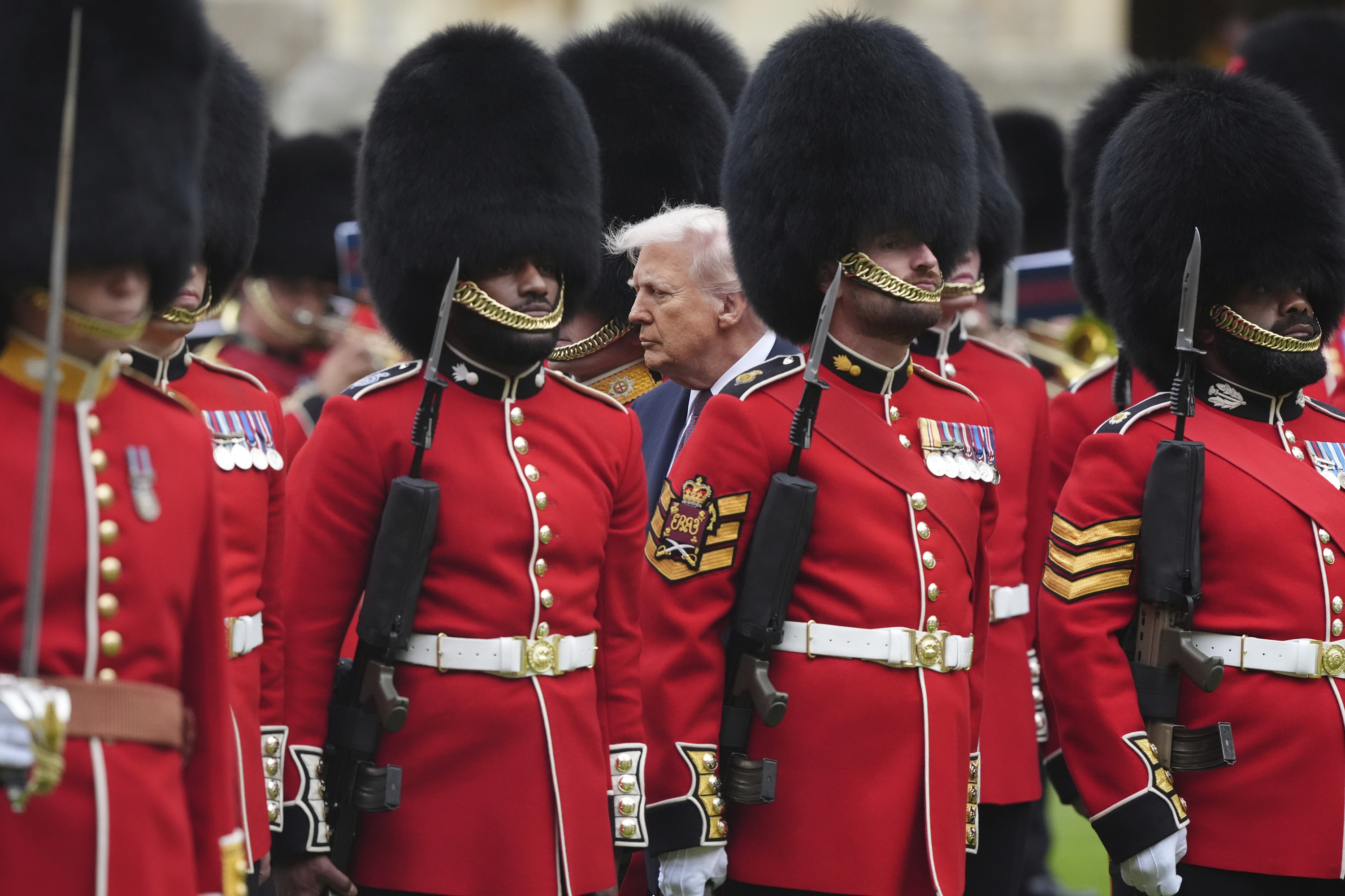 Η εθιμοτυπία τηρήθηκε με ακρίβεια — τουλάχιστον μέχρι το σημείο όπου οι κάμερες «συνέλαβαν» τον Αμερικανό Πρόεδρο να περπατά μπροστά από τον Βασιλιά Κάρολο κατά τη διάρκεια της επιθεώρησης του Τιμητικού Αγήματος.