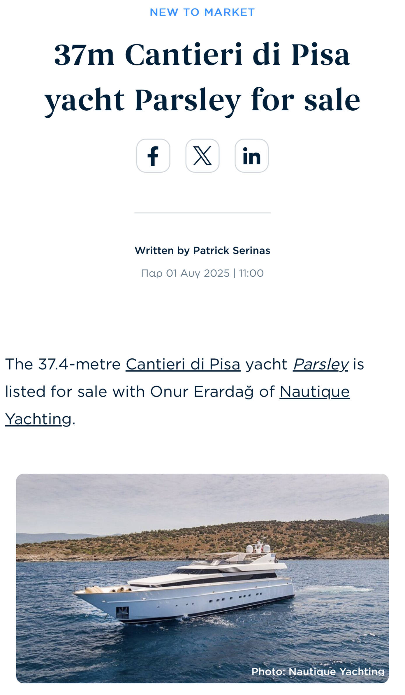 Καθώς το καλοκαίρι πλησιάζει προς το τέλος του, κότερα, θαλαμηγοί και yachts «δένουν» στις μαρίνες της Αττικής, προκειμένου να γίνουν σε αυτά οι απαιτούμενες εργασίες συντήρησης μέχρι την επόμενη φορά. Μιλώντας με έναν φίλο που ασχολείται με τη συντήρηση τέτοιων σκαφών, μου ήρθε η είδηση που αφορούσε τη θρυλική θαλαμηγό του Σωκράτη Κόκκαλη, το περίφημο «Bux K», που με το νέο όνομά του «Parsley» έχει βγει προς πώληση. Από την έρευνα που έκανα στη συνέχεια, διαπίστωσα πως το εκπληκτικό σκάφος των 38 μέτρων, που κατασκευάστηκε από το ναυπηγείο Cantieri di Pisa και παραδόθηκε το 2001, προσφέρεται στην τιμή των 3,5 εκατομμυρίων ευρώ, ενώ για πρώτη φορά παρουσιάζονται φωτογραφίες από το εσωτερικό και τα σαλόνια του. Σαλόνια που φιλοξένησαν, την εποχή της ιδιοκτησίας του από τον ισχυρό Έλληνα επιχειρηματία, ισχυρές προσωπικότητες από την Ελλάδα και το εξωτερικό. Από τη μια, ο Σωκράτης Κόκκαλης ποτέ δεν έδωσε το σκάφος του για ενοικίαση, και κατά δεύτερον, φρόντιζε ως καλός οικοδεσπότης πάντα να παρέχει πλήρη ιδιωτικότητα σε αυτούς που ταξίδευαν με αυτό. Το ερώτημα ωστόσο που παραμένει, καθώς η πώληση του «Parsley» πλέον διαφημίζεται στις μεγαλύτερες ιστοσελίδες σχετικά με το yachting, είναι το πότε ο Έλληνας επιχειρηματίας αποχωρίστηκε το σκάφος του, καθώς η θαλαμηγός έχει αλλάξει ήδη δύο ονόματα μετά το «Bux K», που παρεμπιπτόντως ήταν το nickname της συζύγου του, Ελένης Κόκκαλη, με πρώτο το «Enki» και δεύτερο το όνομα «Parsley».