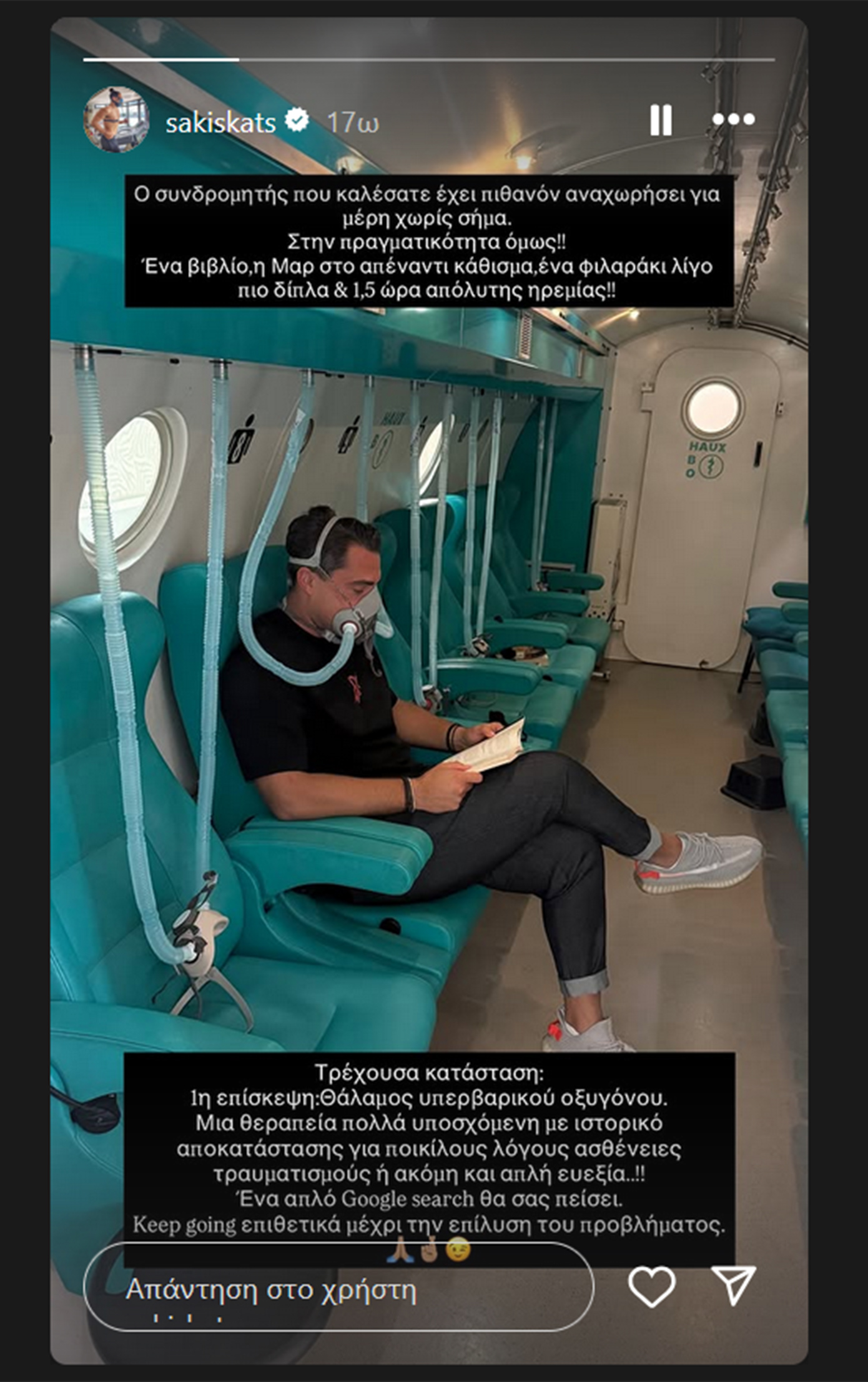 Ο Σάκης Κατσούλης, λίγο καιρό μετά τη διάγνωση αιφνίδιας βαρηκοΐας, ενημέρωσε ξανά τους διαδικτυακούς του φίλους για την πορεία της υγείας του. Αυτή τη φορά δημοσίευσε στα Instagram Stories μια φωτογραφία μέσα από θάλαμο υπερβαρικού οξυγόνου, όπου ακολουθεί θεραπεία.