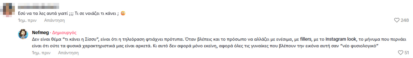 «Εσένα τι σε νοιάζει τι κάνει;», τη ρώτησε μια γυναίκα με τη Νεφέλη Μεγκ να απαντά: «Δεν είναι θέμα “τι κάνει η Σίσσυ”, είναι ότι η τηλεόραση φτιάχνει πρότυπα. Όταν βλέπεις και το πρόσωπο να αλλάζει με ενέσιμα, με fillers, με το Instagram look, το μήνυμα που περνάει είναι ότι ούτε τα φυσικά χαρακτηριστικά μας είναι αρκετά. Κι αυτό δεν αφορά μόνο εκείνη, αφορά όλες τις γυναίκες που βλέπουν την εικόνα αυτή σαν “νέο φυσιολογικό|».