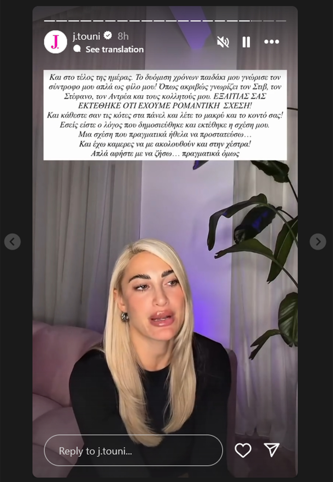 «Θέλω να ζήσω φυσιολογικά όσο γίνεται τη ζωή μου. Είναι δικαίωμά μου. Δεν γίνεται να μιλάει κανείς για το τι έχω και τι δεν έχω δικαίωμα να κάνω. Δεν νομίζω να εξέθεσα κάποιον. Εσείς εκθέτετε τα προσωπικά μου. Εγώ δεν ήθελα να μιλήσω γι’ αυτή τη σχέση, ήθελα να το προστατεύσω όλο αυτό και έχετε βαλθεί να βγάζετε διάφορα και νιώθω ένα πνίξιμο. Πρέπει να μιλήσω για κάτι για το οποίο δεν ήθελα και να επισημοποιήσω κάτι που δεν ήθελα. Θα το έκανα αυτό μόνο αν είχα δαχτυλίδι, που δεν έχω. Βρίσκομαι εδώ να απολογούμαι, να εξηγώ, σε κάποιους που όντως θέλουν να μάθουν και κάποιους που θέλουν να κουτσομπολέψουν. Δεν πειράζει, καλώς ήλθατε, καθίστε αναπαυτικά», συνέχισε η Ιωάννα Τούνη.