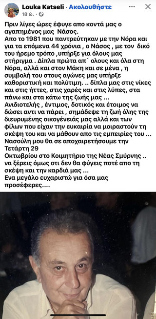 Η εβδομάδα που ξεκίνησε, είχε και τις απώλειες της. Όπως έμαθα η Νόρα Κατσέλη έχασε τον δεύτερο σύζυγο της Νάσο Καλογερόπουλο με τον οποίο πορεύτηκαν στη ζωή για σαραντα τέσσερα χρόνια, από το 1981 που παντρεύτηκαν. Αύριο Τετάρτη 29 Οκτωβρίου θα πραγματοποιηθεί η εξόδιος ακολουθία στο Κοιμητήριο της Νέας Σμύρνης.