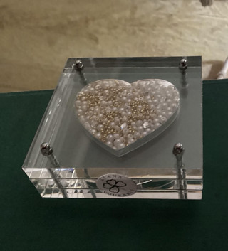 Από τις κομψές μπομπονιέρες, pres papier με μια μεγάλη καρδιά στο κέντρο, δημιουργία του Οίκου της Λιάνας Βουράκη, μέχρι το menu της δεξίωσης που παρουσιάστηκε σε ένα καλαίσθητο μικρό βιβλίο που το εξώφυλλό του φιλοξενούσε τα αρχικά των νεονύμφων.