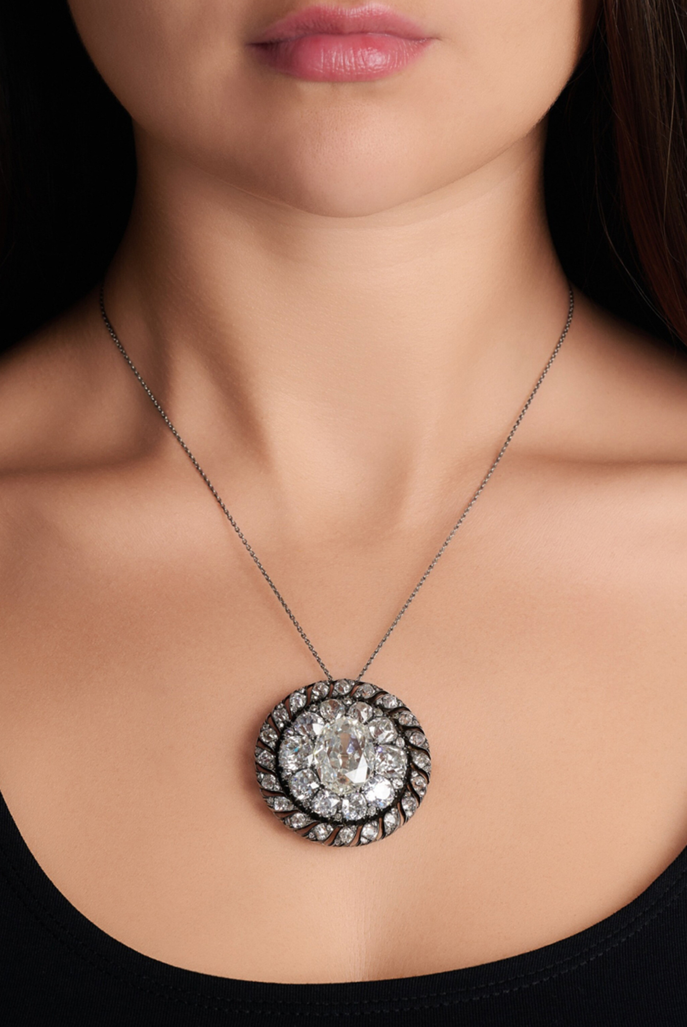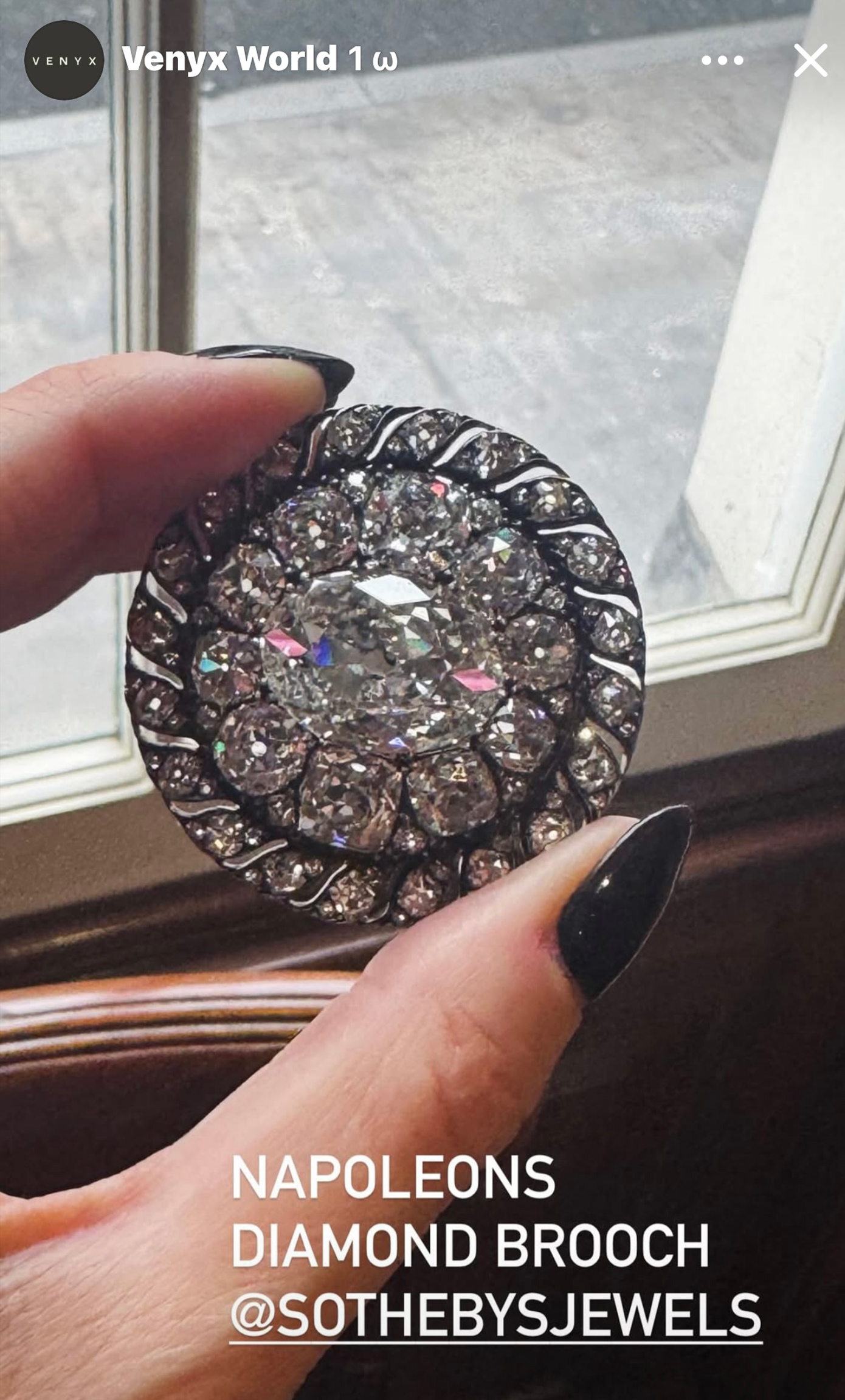 Κρατώντας στα χέρια της μια ιδιαίτερα σημαντική και βαρύτιμη καρφίτσα με διαμάντια που μετατρέπεται και σε ποντατίφ και ανήκε στη συλλογή κοσμημάτων του Αυτοκράτορα Ναπολέοντα του Ι, η Ευγενία Νιάρχου αποτύπωσε σε φωτογραφία την υψηλή κοσμηματοποιία της εποχής στο προσωπικό της ιστολόγιο. Η καρφίτσα με τη σπουδαία ιστορική σημασία, που φέρει πολύ σημαντικά διαμάντια ίδιας κοπής σε όλο το μήκος και το πλάτος της, θα δημοπρατηθεί σε λίγες ημέρες έναντι του ποσού των 320,000 CHF ως «lot 665» στη μεγάλη δημοπρασία που ετοιμάζει ο Οίκος Sotheby’s στη χώρα των Άλπεων.
