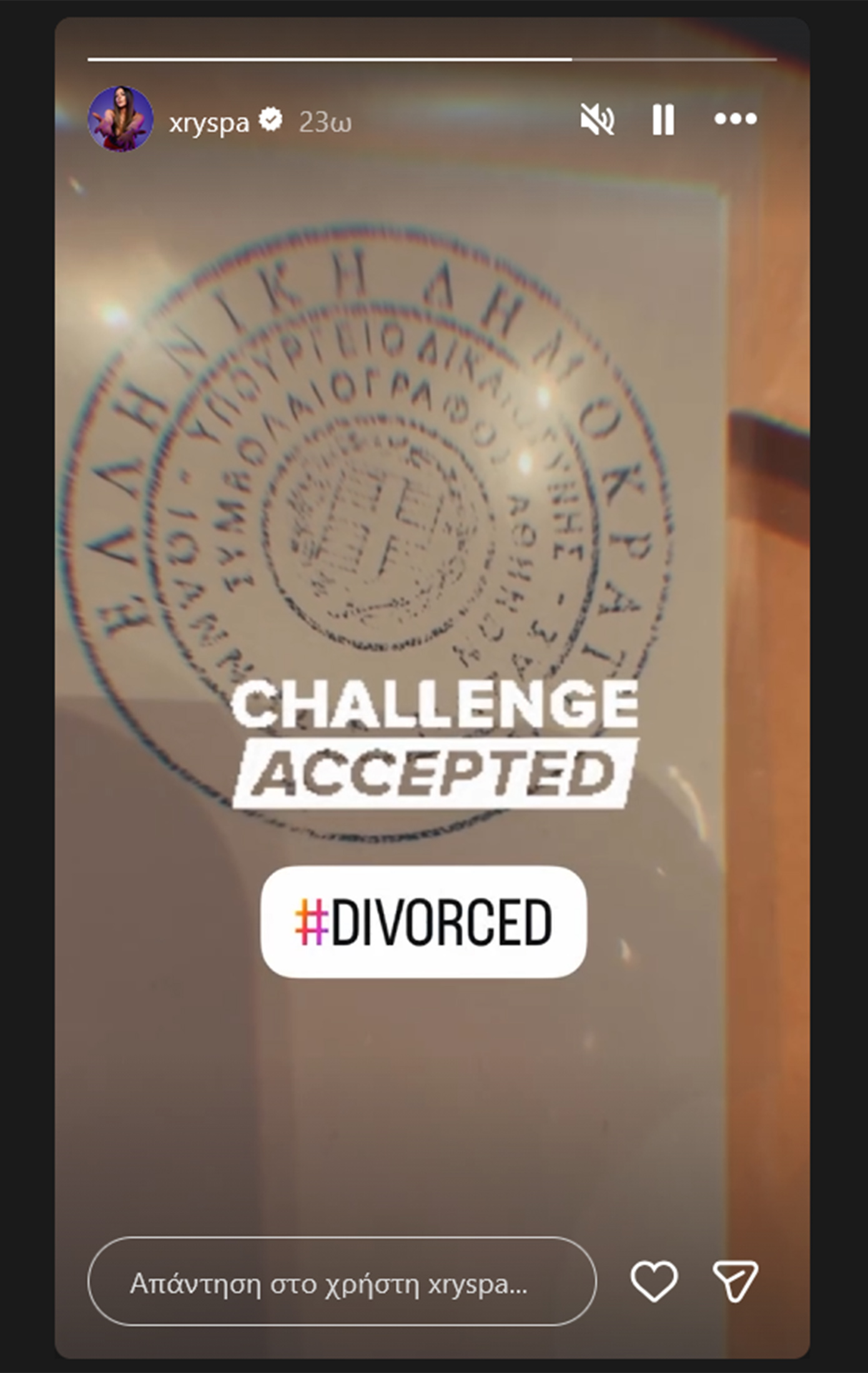 Η Χρύσπα κοινοποίησε στον προσωπικό της λογαριασμό στο Instagram ένα story με τη σφραγίδα του συμβολαιογράφου, συνοδευόμενο από τη λεζάντα: «Αποδέχομαι την πρόκληση. Χωρισμένη».