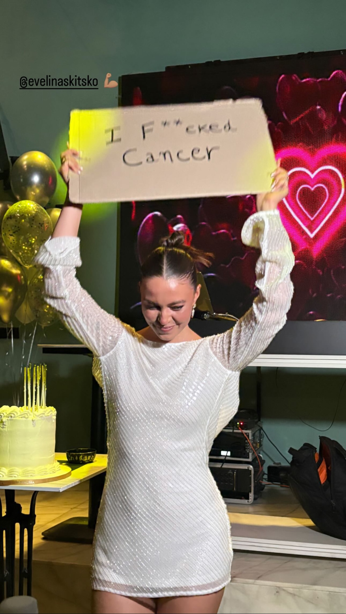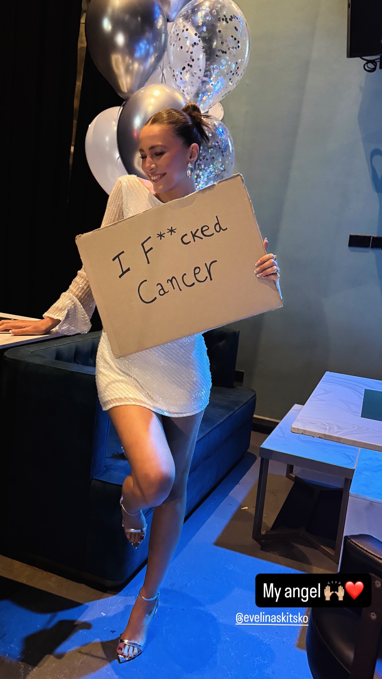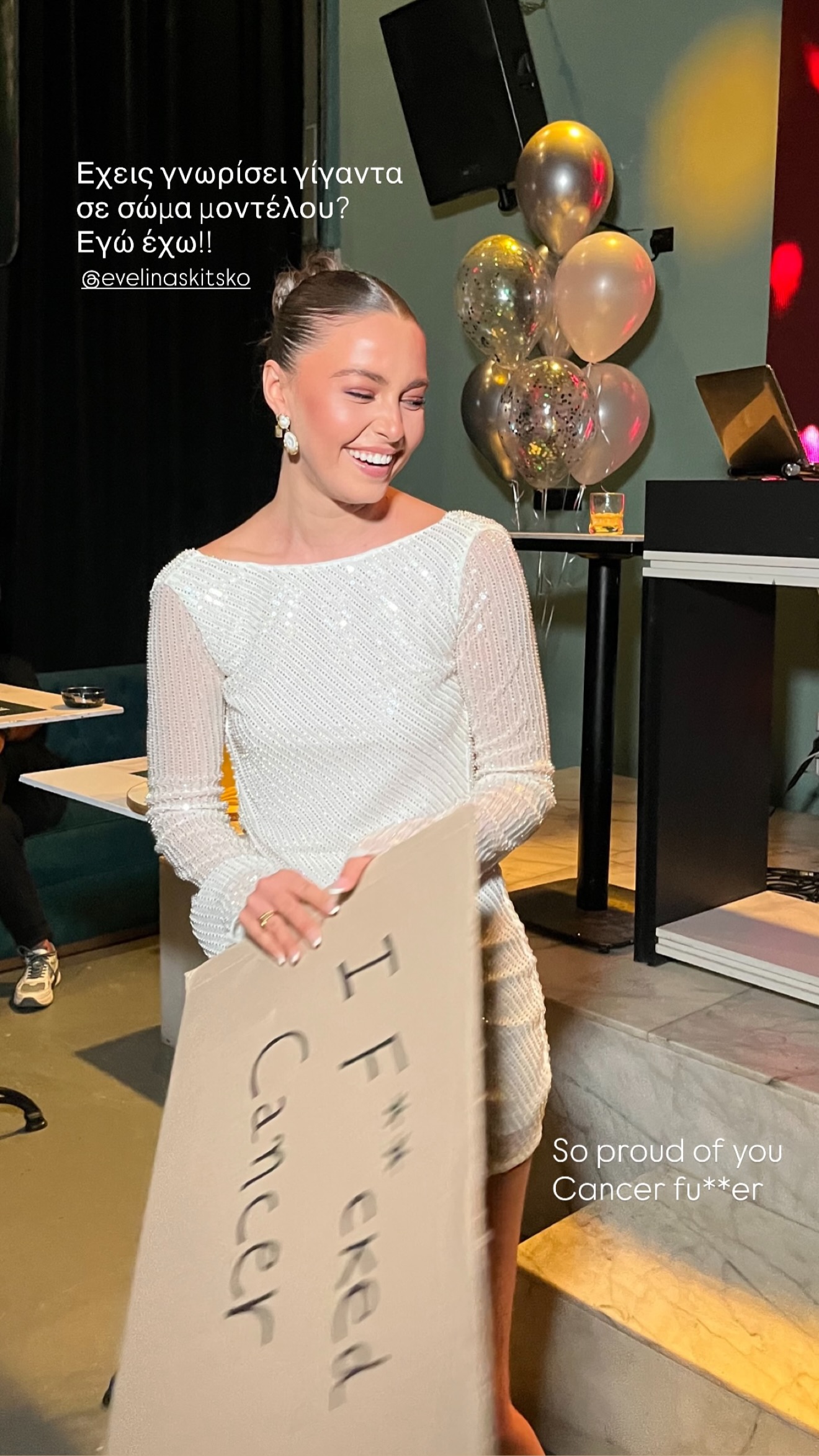 Όλα δείχνουν πως αυτή η δύσκολη περίοδος έχει μείνει πίσω της. Όπως φαίνεται και στις φωτογραφίες που ανέβασε η Εβελίνα Σκίτσκο στο Instagram, η ίδια γιόρτασε κάτι σαν… δεύτερη ζωή. Το εντυπωσιακό μοντέλο από την Κύπρο πόζαρε κρατώντας μια χάρτινη πινακίδα που έγραφε «Γά…σα τον καρκίνο!».