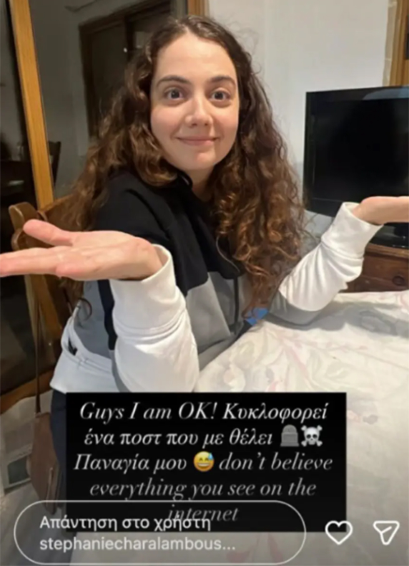 Η Στέφανη Χαραλάμπους στον προσωπικό της λογαριασμό στο Instagram έγραψε: «Guys I am OK! Κυκλοφορεί ένα ποστ που με θέλει νεκρή. Παναγία μου, don’t believe everything you see on the internet».
