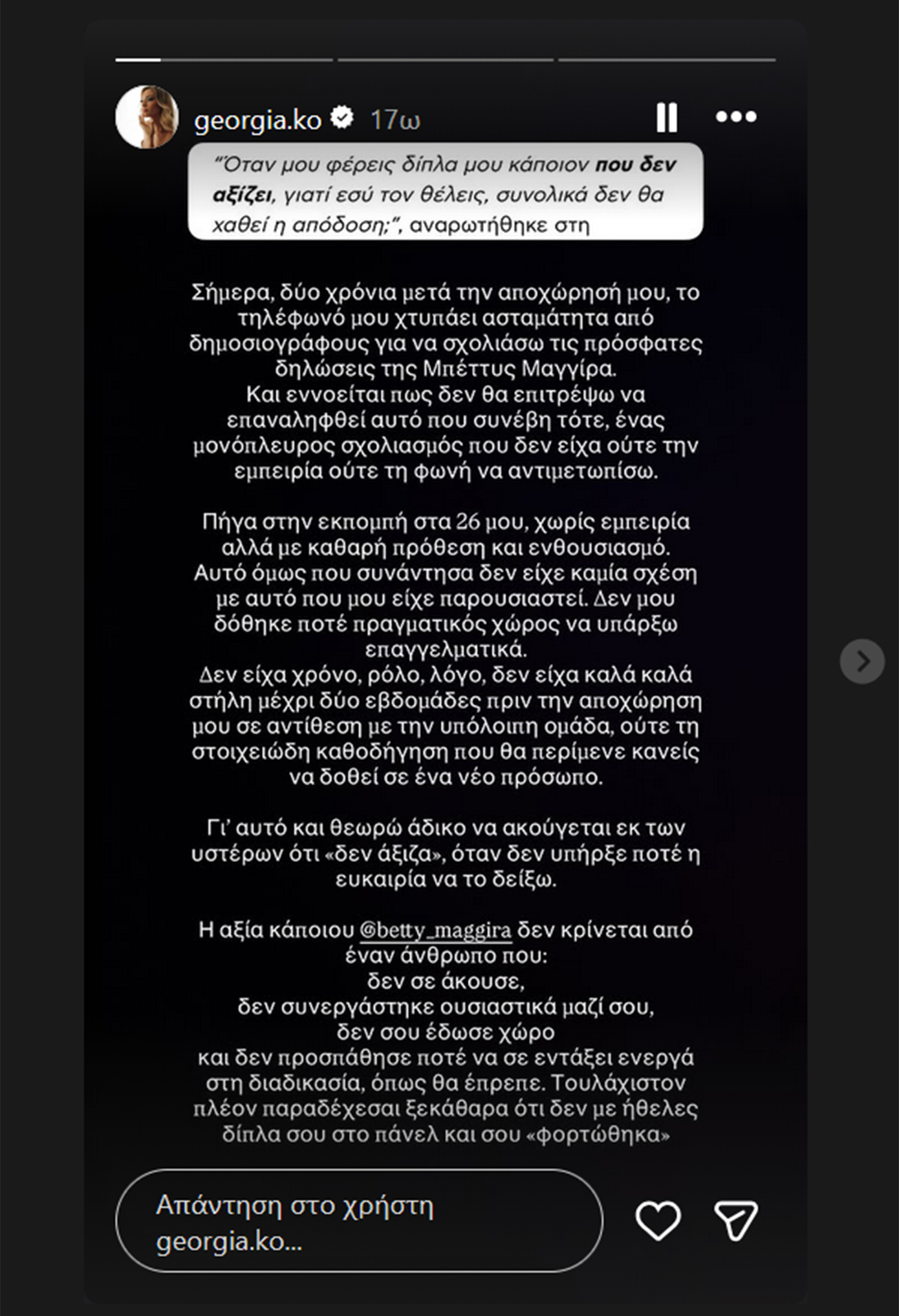 Μετά το μήνυμα της Τζο Κουτσοκώστα, η Μπέττυ Μαγγίρα, θέλησε να ξεκαθαρίσει τα πράγματα. Χαρακτηριστικά, η παρουσιάστρια τόνισε: «Νιώθω την ανάγκη να πω κάτι, γιατί όλος αυτός ο ντόρος που έγινε σήμερα, έγινε με μια δική μου δήλωση. Αλλού έπρεπε να πέσουν οι προβολείς και όχι σε ένα κορίτσι που στοχοποιήθηκε άδικα. Δεν αφορούσε στο κορίτσι αυτό καθαυτό, ούτε στην αξία του και εννοείται πως έχει αξία. Αφορούσε στο πώς τόσα χρόνια επιλέγονται κάποιοι άνθρωποι να είναι σε εκπομπές που μπορεί να μην ταιριάζουν, να μην έπρεπε να είναι τη δεδομένη στιγμή. Μου έχει συμβεί και σε άλλη εκπομπή, σε άλλο κανάλι, να μου φέρουν άνθρωπο που δεν ήθελα να δω, και να τον βάζουν σε μια εκπομπή και να χάνει το σύνολο. Εκεί έπρεπε να μείνει και όχι σε αυτό το κορίτσι. Ήταν δικό μου λάθος και αναλαμβάνω την ευθύνη για το ρήμα “αν άξιζε”, το παίρνω πίσω. Άρα, να μη μένουμε στην αξία των συγκεκριμένων ανθρώπων, αλλά τι συμβαίνει γενικότερα στην ελληνική τηλεόραση. Κακώς στοχοποιήθηκε η κοπέλα αυτή, γιατί ίσως είναι και η μόνη που δεν φταίει».