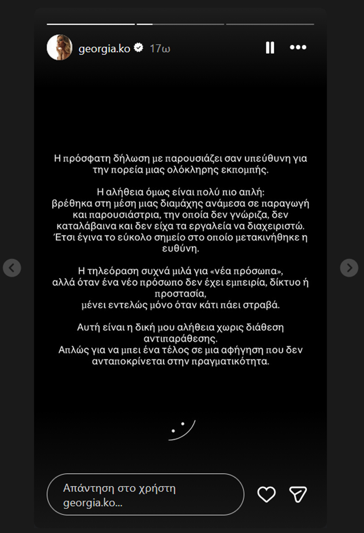 H πρόσφατη δήλωση με παρουσιάζει σαν υπεύθυνη για την πορεία μιας ολόκληρης εκπομπής. Η αλήθεια όμως είναι πολύ πιο απλή: βρέθηκε στη μέση μιας διαμάχης ανάμεσα σε παραγωγή και παρουσιάστρια, την οποία εγώ δεν γνώριζα, δεν καταλάβαινα και δεν είχα τα εργαλεία να διαχειριστώ. Έτσι έγινα το εύκολο σημείο στο οποίο μετακινήθηκε η ευθύνη.