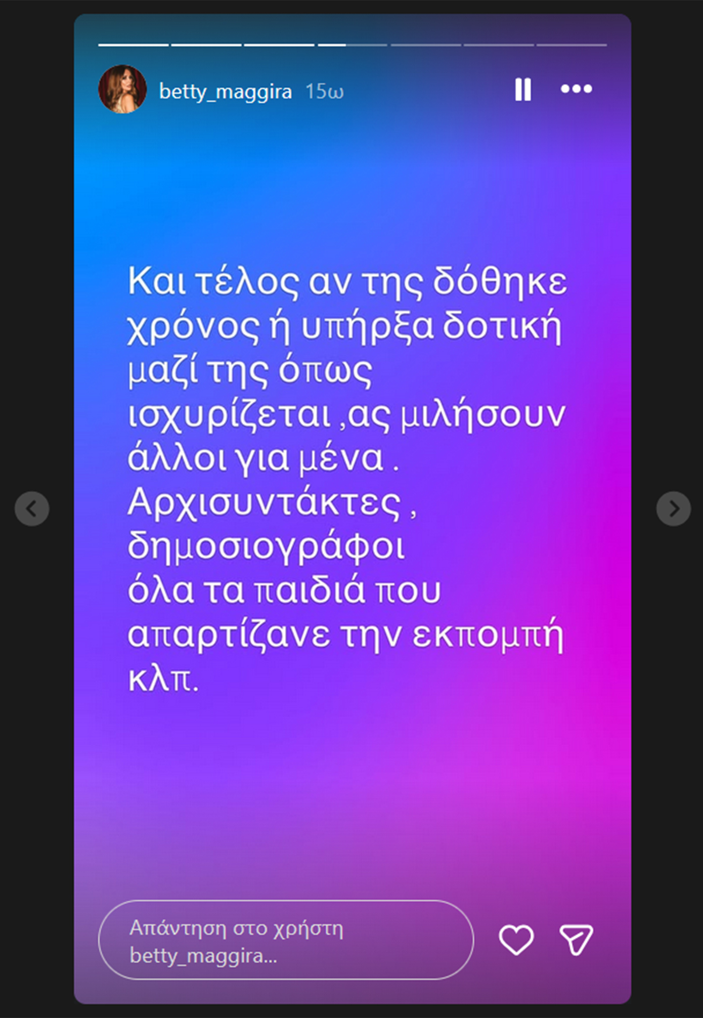 Λίγα λεπτά αργότερα, η Μπέττυ Μαγγίρα σημείωσε: «Και τέλος, αν της δόθηκε χρόνος ή αν υπήρξα δοτική μαζί της, όπως ισχυρίζεται, ας μιλήσουν άλλοι για μένα. Αρχισυντάκτες, δημοσιογράφοι, όλα τα παιδιά που απαρτίζανε την εκπομπή».