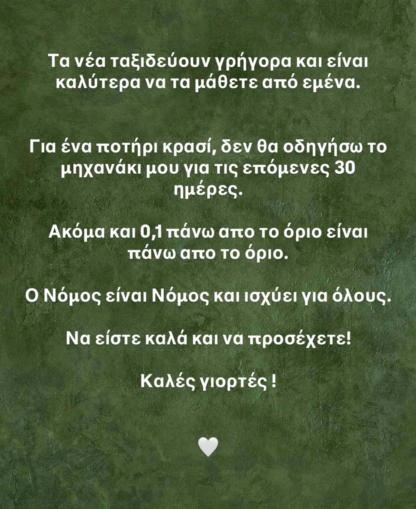 Στη δήλωσή της, η Ζουγανέλη ήταν σαφής, παραδεχόμενη την παράβαση και αναφέροντας: «Τα νέα ταξιδεύουν γρήγορα και είναι καλύτερα να τα μάθετε από εμένα. Για ένα ποτήρι κρασί, δεν θα οδηγήσω το μηχανάκι μου για τις επόμενες 30 ημέρες. Ακόμα και 0,1 πάνω από το όριο είναι πάνω από το όριο. Ο Νόμος είναι Νόμος και ισχύει για όλους. Να είστε καλά και να προσέχετε! Καλές γιορτές!».