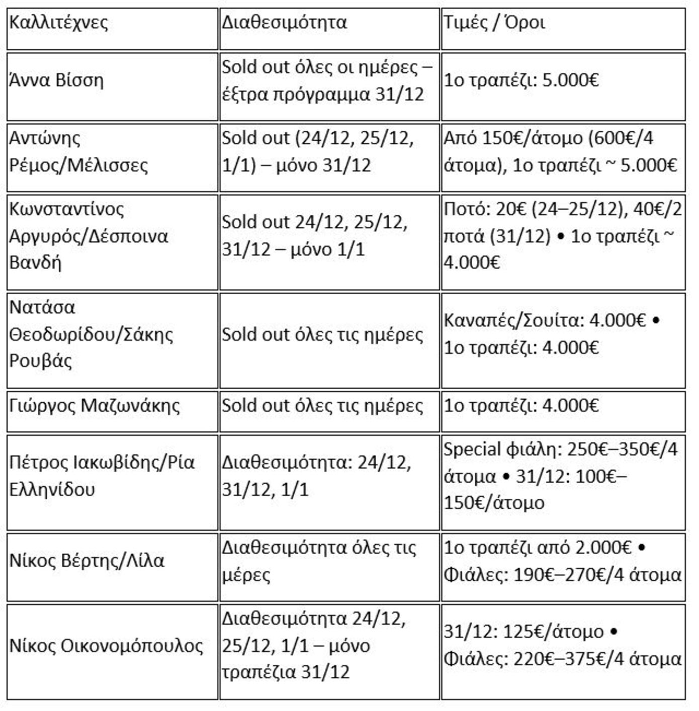 Τα πρώτα τραπέζια, όπως μετέδωσε σε σχετικό της ρεπορτάζ η εκπομπή του Mega «Κοινωνία Ώρα MEGA» φτάνουν έως και τις 5.000 ευρώ, ενώ περιορισμένη διαθεσιμότητα υπάρχει μόνο για συγκεκριμένες ημερομηνίες και σχήματα.