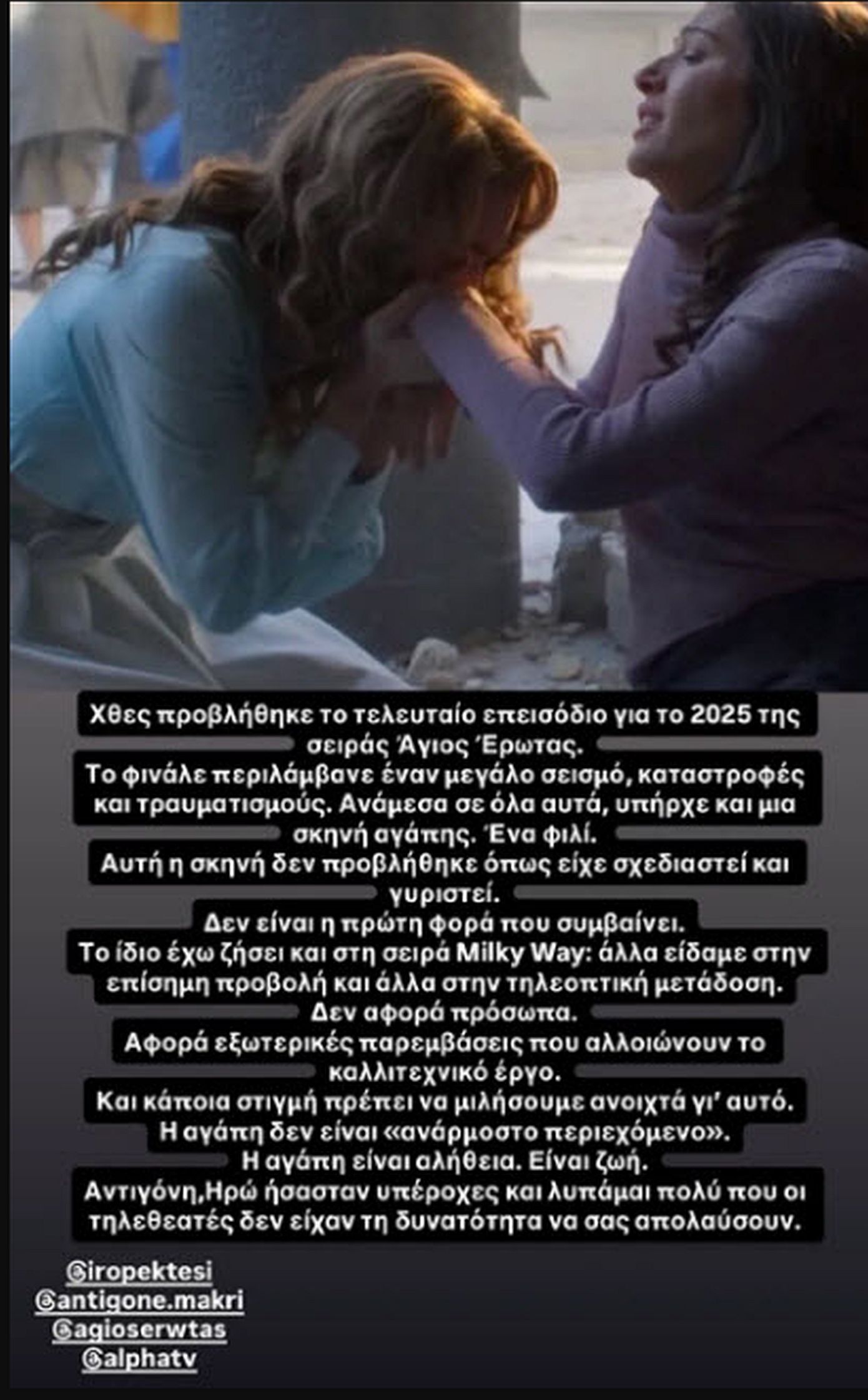 «Χθες προβλήθηκε το τελευταίο επεισόδιο για το 2025 της σειράς Άγιος Έρωτας. Το φινάλε περιλάμβανε έναν μεγάλο σεισμό, καταστροφές και τραυματισμούς. Ανάμεσα σε όλα αυτά, υπήρχε και μια σκηνή αγάπης. Ένα φιλί. Αυτή η σκηνή δεν προβλήθηκε όπως είχε σχεδιαστεί και γυριστεί», γράφει η Γιούλικα Σκαφιδά.