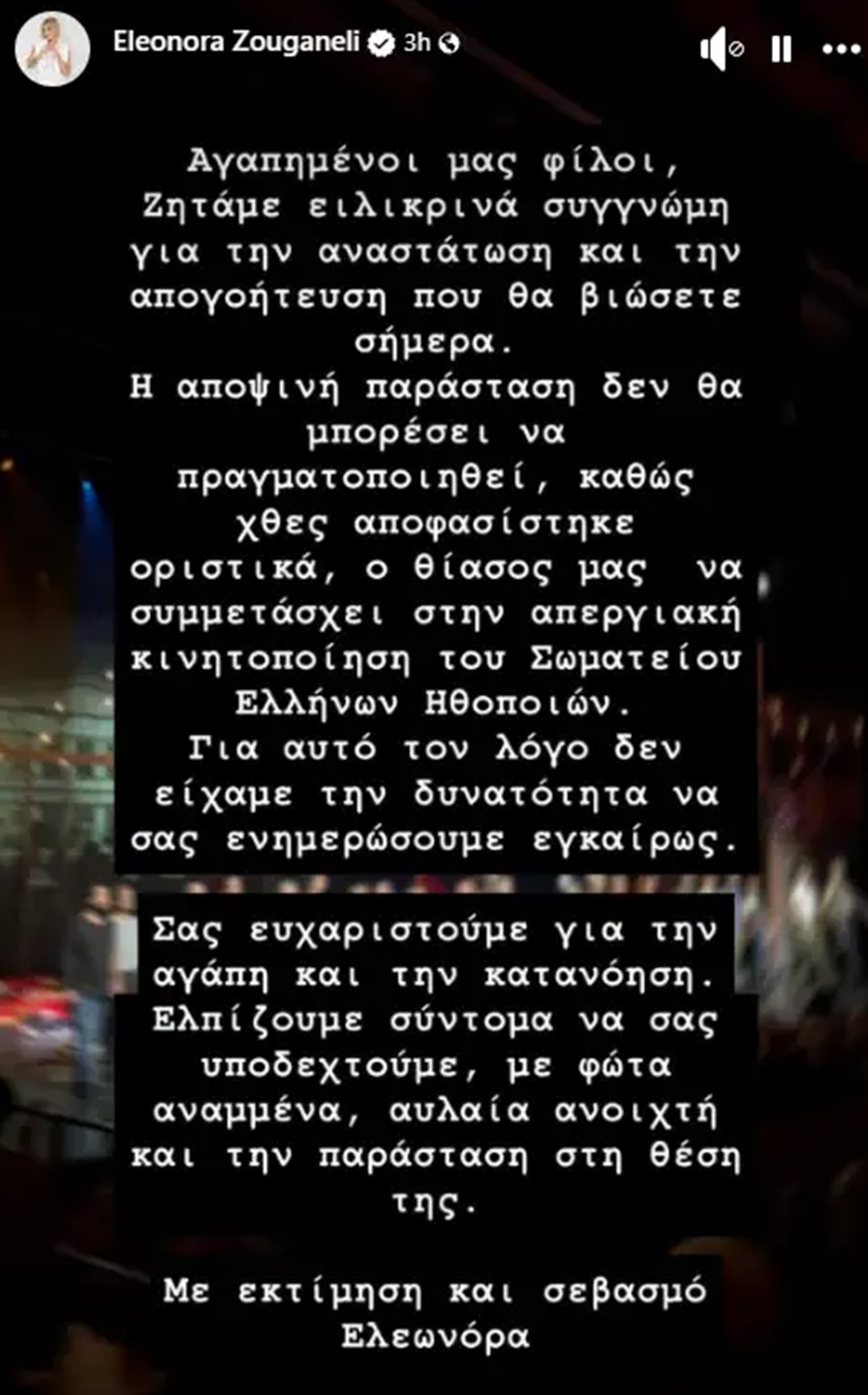 «Αγαπημένοι μας φίλοι, ζητάμε ειλικρινά συγγνώμη για την αναστάτωση και την απογοήτευση που θα βιώσετε σήμερα. Η αποψινή παράσταση δεν θα μπορέσει να πραγματοποιηθεί, καθώς χθες αποφασίσαμε οριστικά ο θίασός μας να συμμετάσχει στην απεργιακή κινητοποίηση του ΣΕΗ. Για αυτόν τον λόγο δεν είχαμε τη δυνατότητα να σας ενημερώσουμε εγκαίρως», γράφει η τραγουδίστρια.