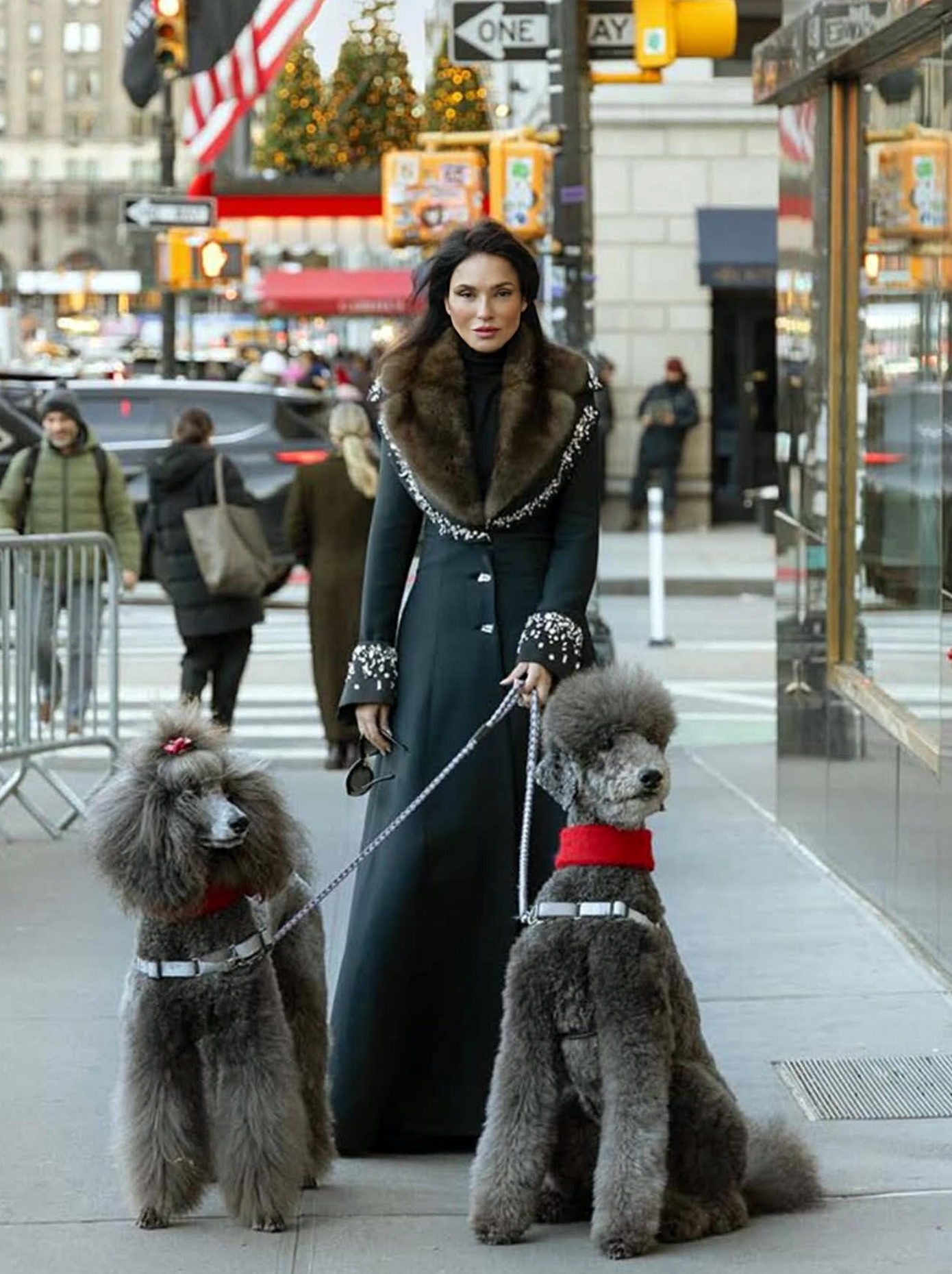 Στους «δεύτερους» ρόλους βρέθηκαν δύο υπέροχα κανίς poodle σκυλιά, που ακούνε στα ονόματα Josephine και Nico, που και οι δύο ήσαν αρκετά πειθαρχημένες, προκειμένου το αισθητικό αποτέλεσμα της φωτογράφισης να είναι άψογο και άκρως εορταστικό με φόντο το Big Apple, όπου περνά τις ημέρες των εορτών η οικογένεια Τσάκου.
