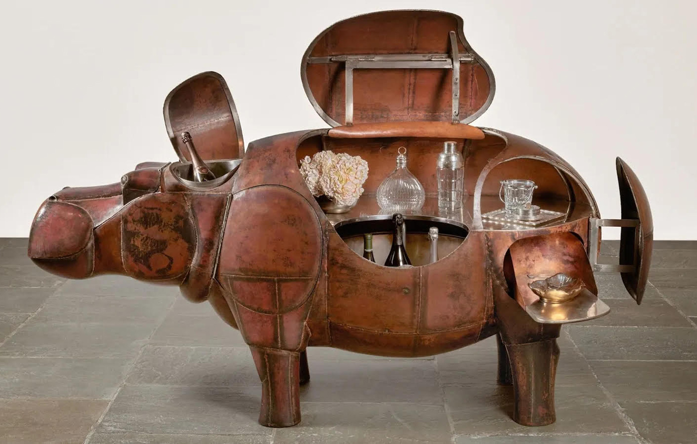 Ο ιπποπόταμος διαθέτει έξυπνες πόρτες κρυμμένες στη οσφυϊκή χώρα, το κεφάλι και το πόδι του αποκαλύπτουν έναν κουβά με πάγο, ενώ διαθέτει και μια περιστρεφόμενη βάση για μπουκάλια καθώς και χώρο για ορεκτικά και ποτήρια.