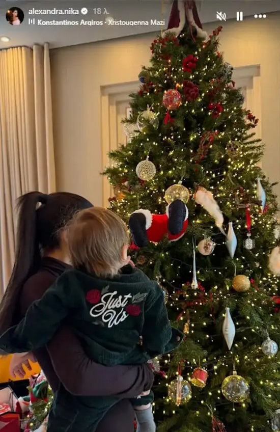 Η σύντροφος του Κωνσταντίνου Αργυρού, κρατάει αγκαλιά τον γιο της, την ώρα που βρίσκονται μπροστά από το χριστουγεννιάτικο δέντρο του σπιτιού τους.
