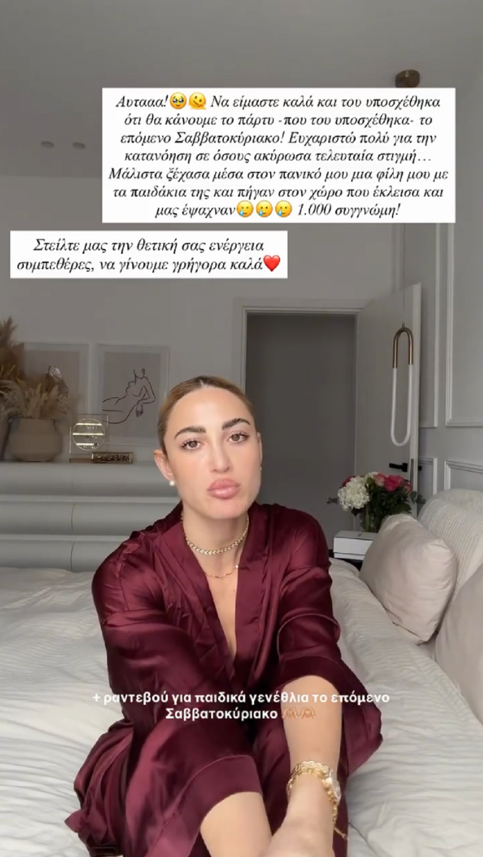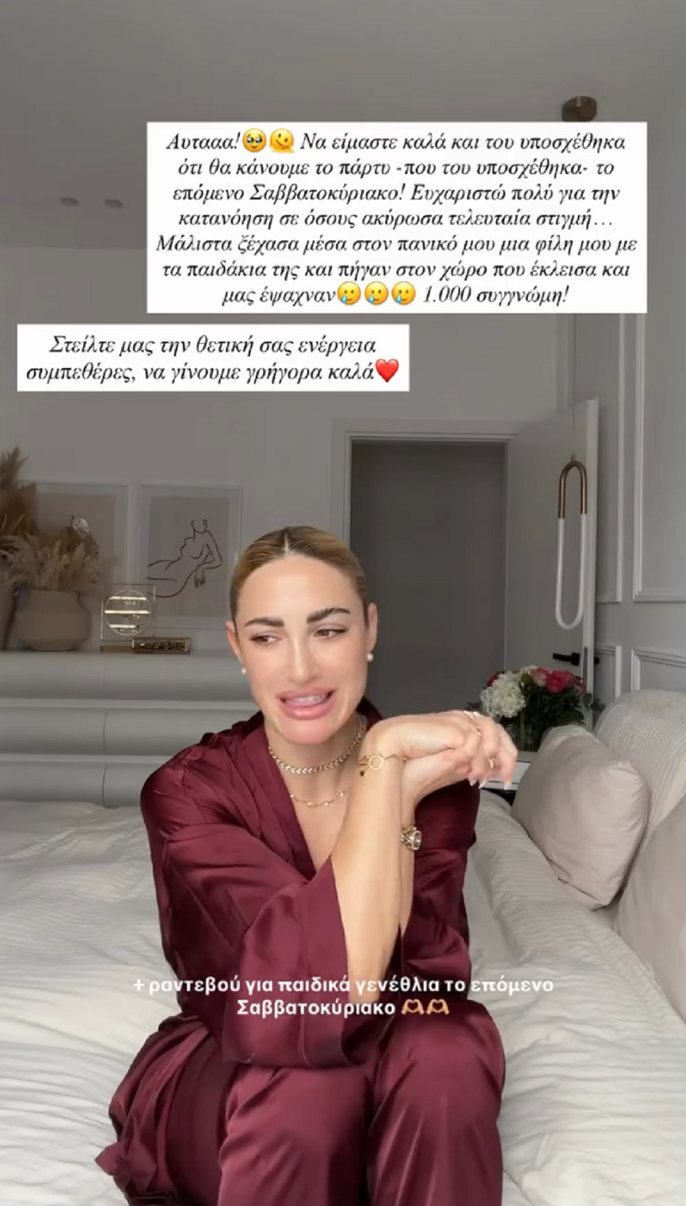 Παράλληλα, με τις λεζάντες, η Ιωάννα Τούνη εξέφρασε την ανησυχία της για τον γιο της στα Instastories της. «Χθες σου είπα ότι θα πήγαινα στο αεροδρόμιο να πάρω τον Παρούλη, τον οποίο Παρούλη παρέλαβα χάλια. Το μωρό είχε πυρετό, βασικά απορώ γιατί πέταξε, αλλά δεν θα μείνουμε εκεί πέρα. Κανονικά σήμερα ήταν να κάνω τα γενέθλια του Πάρη και ήμουν πάρα πολύ ενθουσιασμένη και είχα κάνει πάρα πολλά…