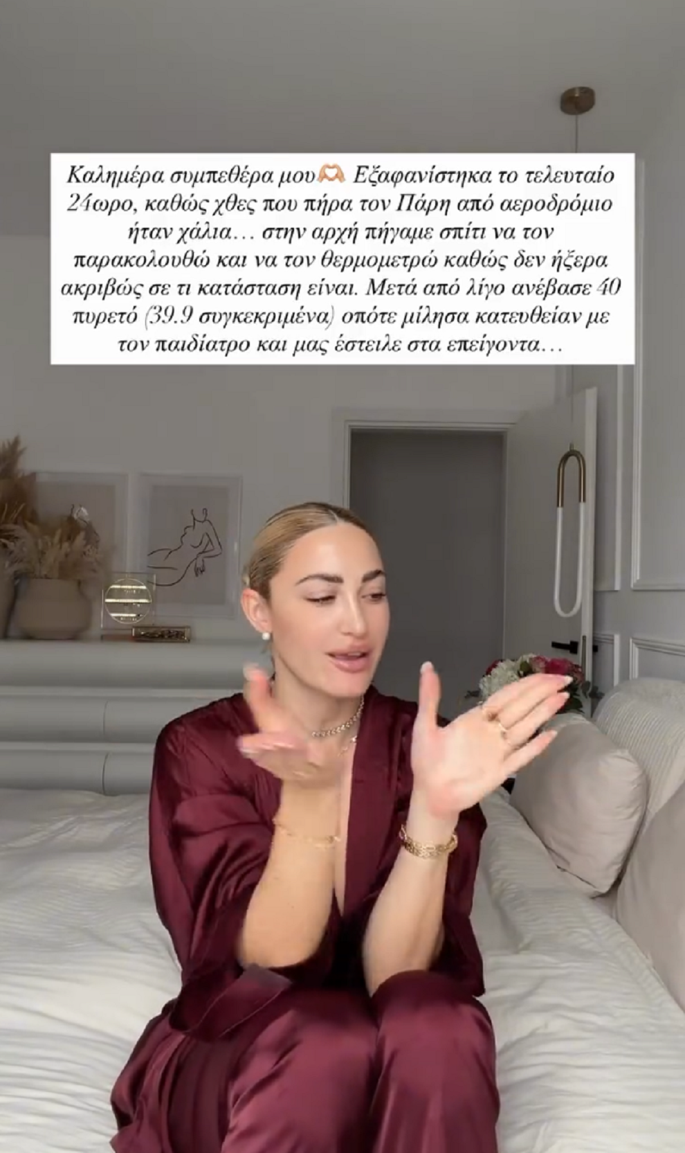 «Εξαφανίστηκα το τελευταίο 24ωρο καθώς χθες που πήρα τον Πάρη από το αεροδρόμιο ήταν χάλια… Στην αρχή πήγαμε σπίτι να τον παρακολουθώ και να τον θερμομετρώ καθώς δεν ήξερα ακριβώς σε τι κατάσταση είναι. Μετά από λίγο ανέβασε 40 πυρετό (39.9 συγκεκριμένα) οπότε μίλησα κατευθείαν με τον παιδίατρό μας και μας έστειλε στα επείγοντα…