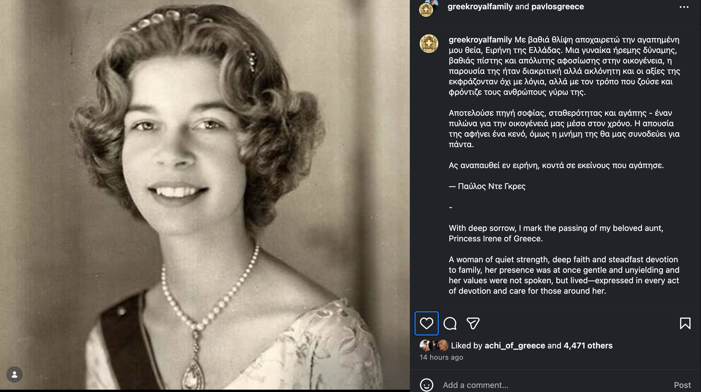 Στην ανάρτησή του, ο Παύλος έκανε λόγο για μια προσωπικότητα διακριτική, με ακλόνητη πίστη και βαθιά αφοσίωση στους ανθρώπους της. Τόνισε πως οι αξίες της δεν εκφράζονταν με μεγάλα λόγια, αλλά αποτυπώνονταν καθημερινά μέσα από πράξεις φροντίδας, συνέπειας και αγάπης. Όπως ανέφερε, η παρουσία της πριγκίπισσας Ειρήνης ήταν σταθερή και καθησυχαστική, αφήνοντας πίσω της ένα δυσαναπλήρωτο κενό.