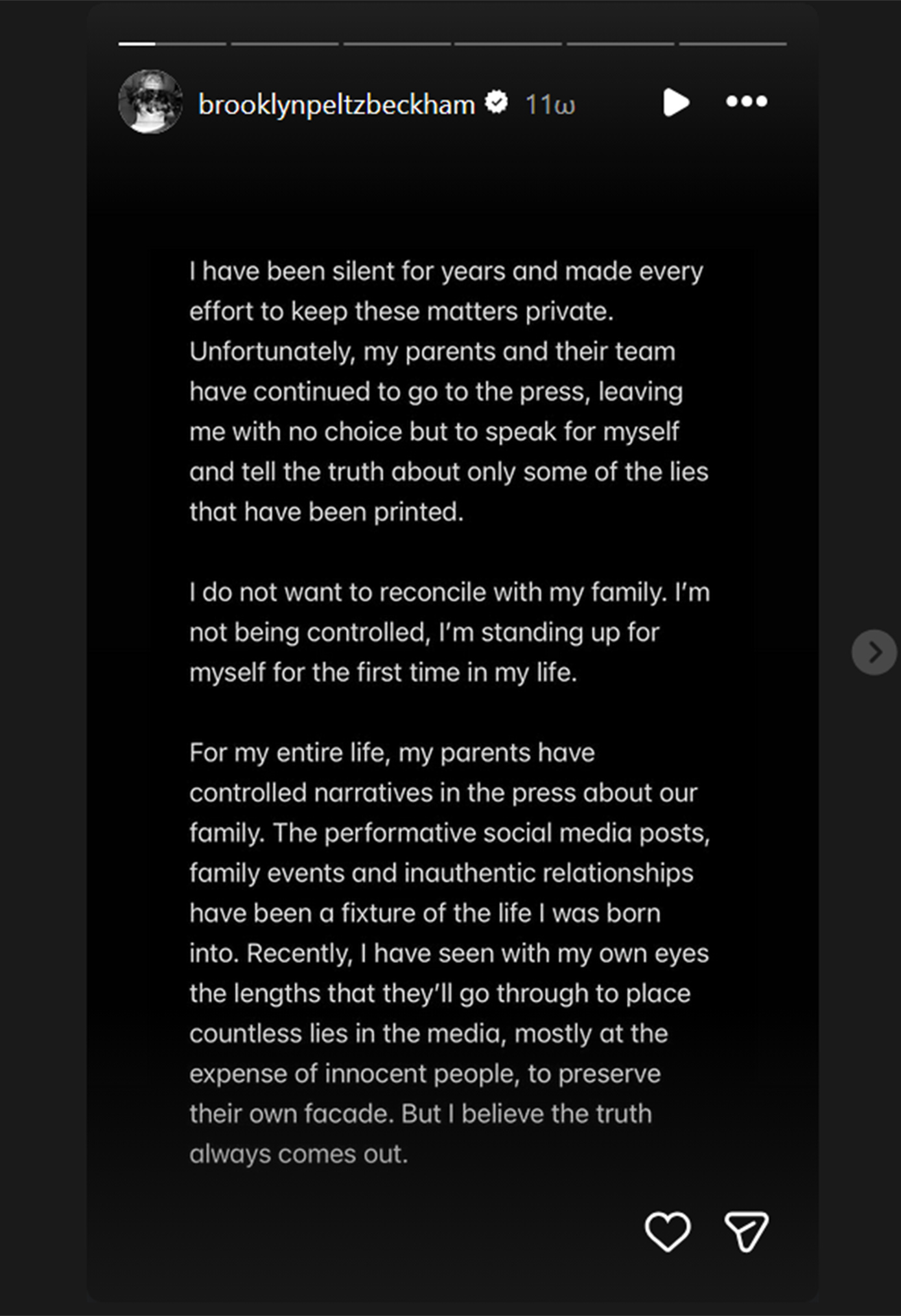 «Δεν θέλω να συμφιλιωθώ με την οικογένειά μου. Δεν με ελέγχουν, υπερασπίζομαι τον εαυτό μου για πρώτη φορά στη ζωή μου. Σε όλη μου τη ζωή, οι γονείς μου διαμόρφωναν τις αφηγήσεις στον Τύπο για την οικογένειά μας. Οι επιδεικτικές αναρτήσεις στα μέσα κοινωνικής δικτύωσης, οι οικογενειακές εκδηλώσεις και οι μη αυθεντικές σχέσεις ήταν ένα σταθερό στοιχείο της ζωής στην οποία γεννήθηκα. Πρόσφατα, είδα με τα ίδια μου τα μάτια μέχρι πού μπορούν να φτάσουν για να διοχετεύσουν αμέτρητα ψέματα στα μέσα ενημέρωσης, συχνά εις βάρος αθώων ανθρώπων, προκειμένου να διατηρήσουν τη βιτρίνα τους. Όμως πιστεύω ότι η αλήθεια πάντα βγαίνει στο φως», συνέχισε.