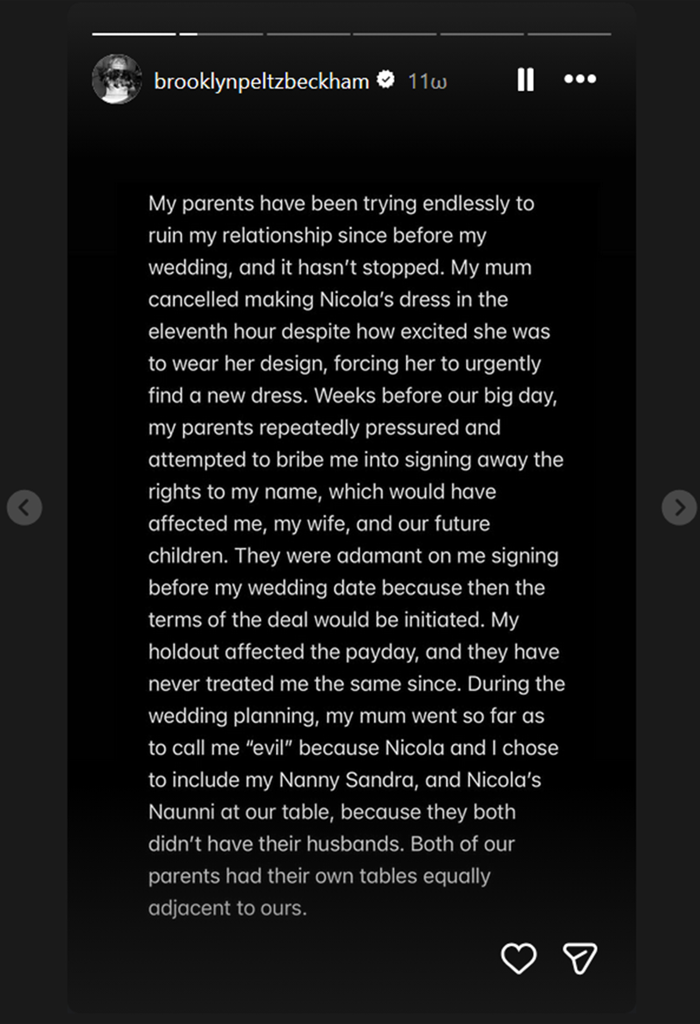 «Οι γονείς μου προσπαθούν αδιάκοπα να καταστρέψουν τη σχέση μου από πριν ακόμη από τον γάμο μου και αυτό δεν έχει σταματήσει. Η μητέρα μου ακύρωσε την τελευταία στιγμή τη δημιουργία του νυφικού της Νίκολα, παρότι εκείνη ανυπομονούσε να φορέσει το σχέδιό της, αναγκάζοντάς την να βρει επειγόντως άλλο φόρεμα», συμπλήρωσε ο Μπρούκλιν. «Λίγες εβδομάδες πριν από τον γάμο μας, οι γονείς μου με πίεζαν επανειλημμένα και προσπάθησαν να με δωροδοκήσουν για να παραιτηθώ από τα δικαιώματα στο όνομά μου, κάτι που θα επηρέαζε εμένα, τη σύζυγό μου και τα μελλοντικά μας παιδιά. Ήταν ανένδοτοι στο να υπογράψω πριν από την ημερομηνία του γάμου, ώστε να τεθούν σε ισχύ οι όροι της συμφωνίας. Η άρνησή μου επηρέασε την πληρωμή και από τότε δεν μου συμπεριφέρονται με τον ίδιο τρόπο», επισήμανε.