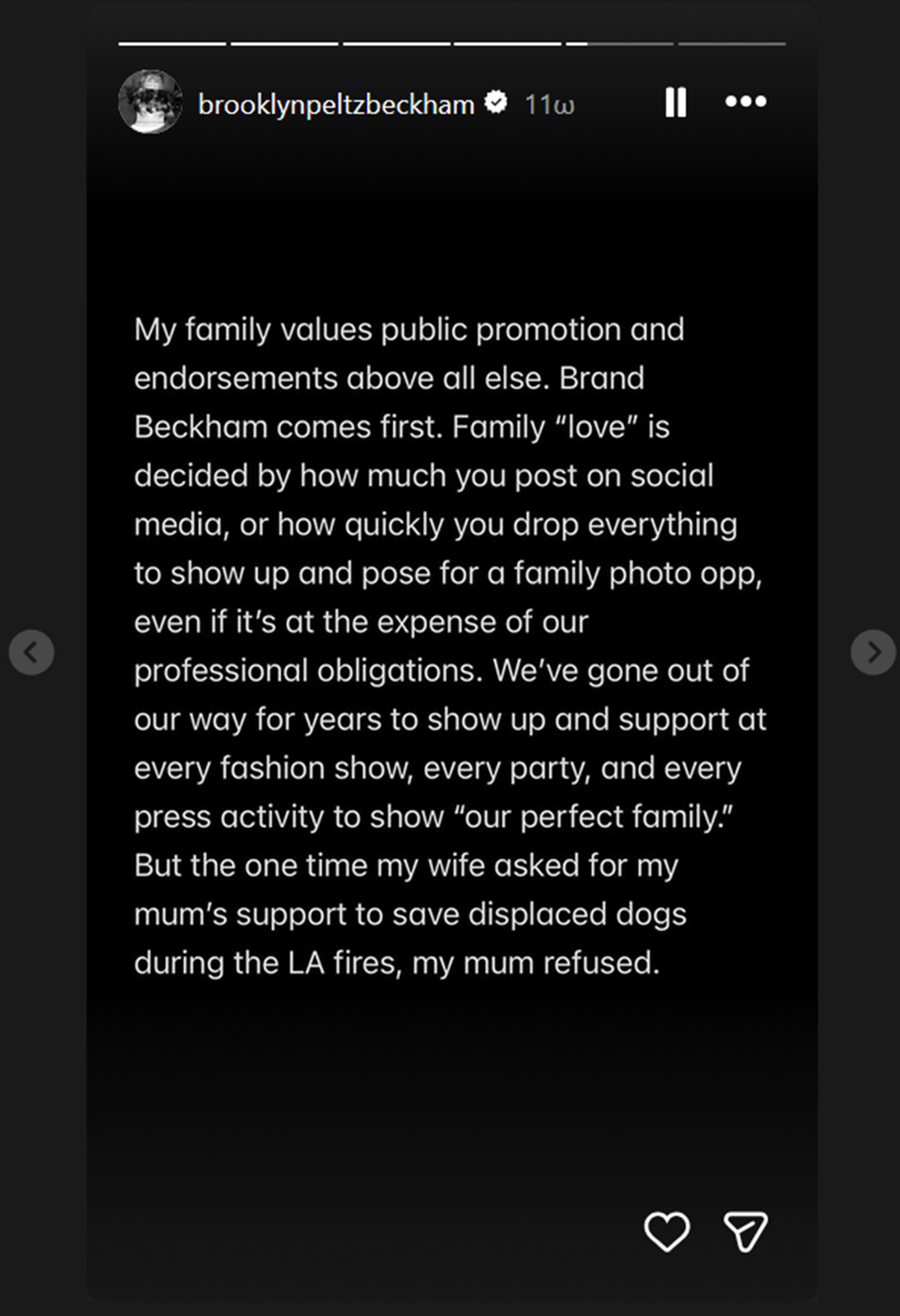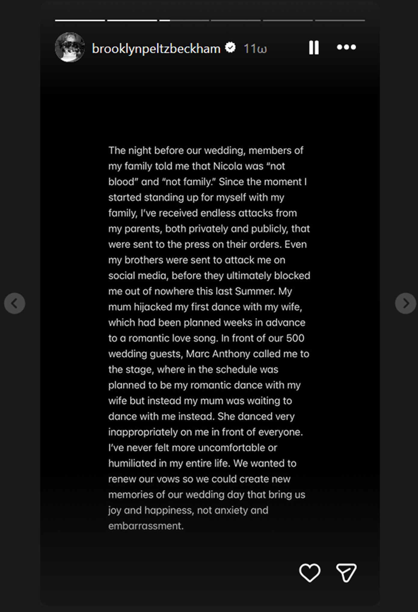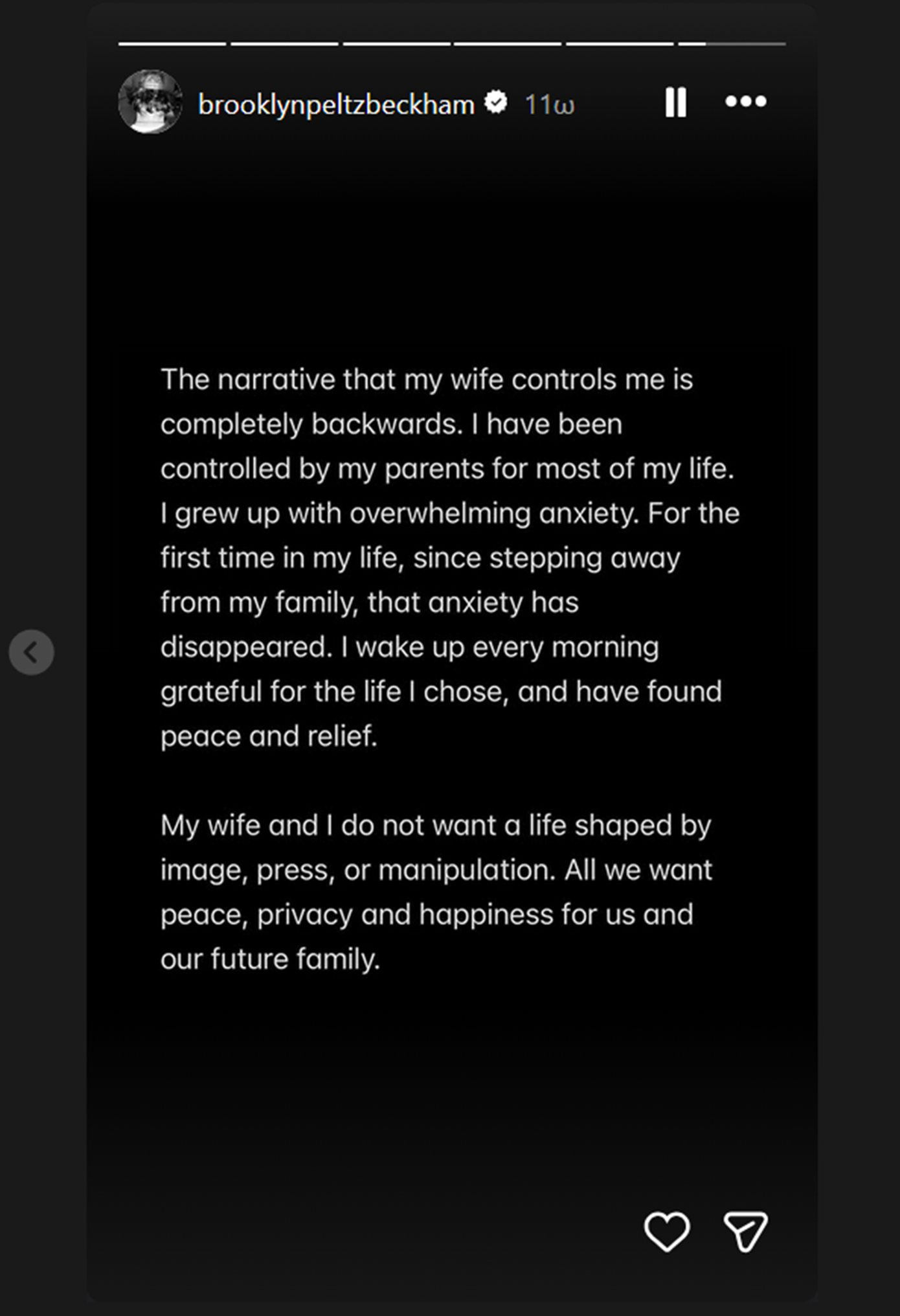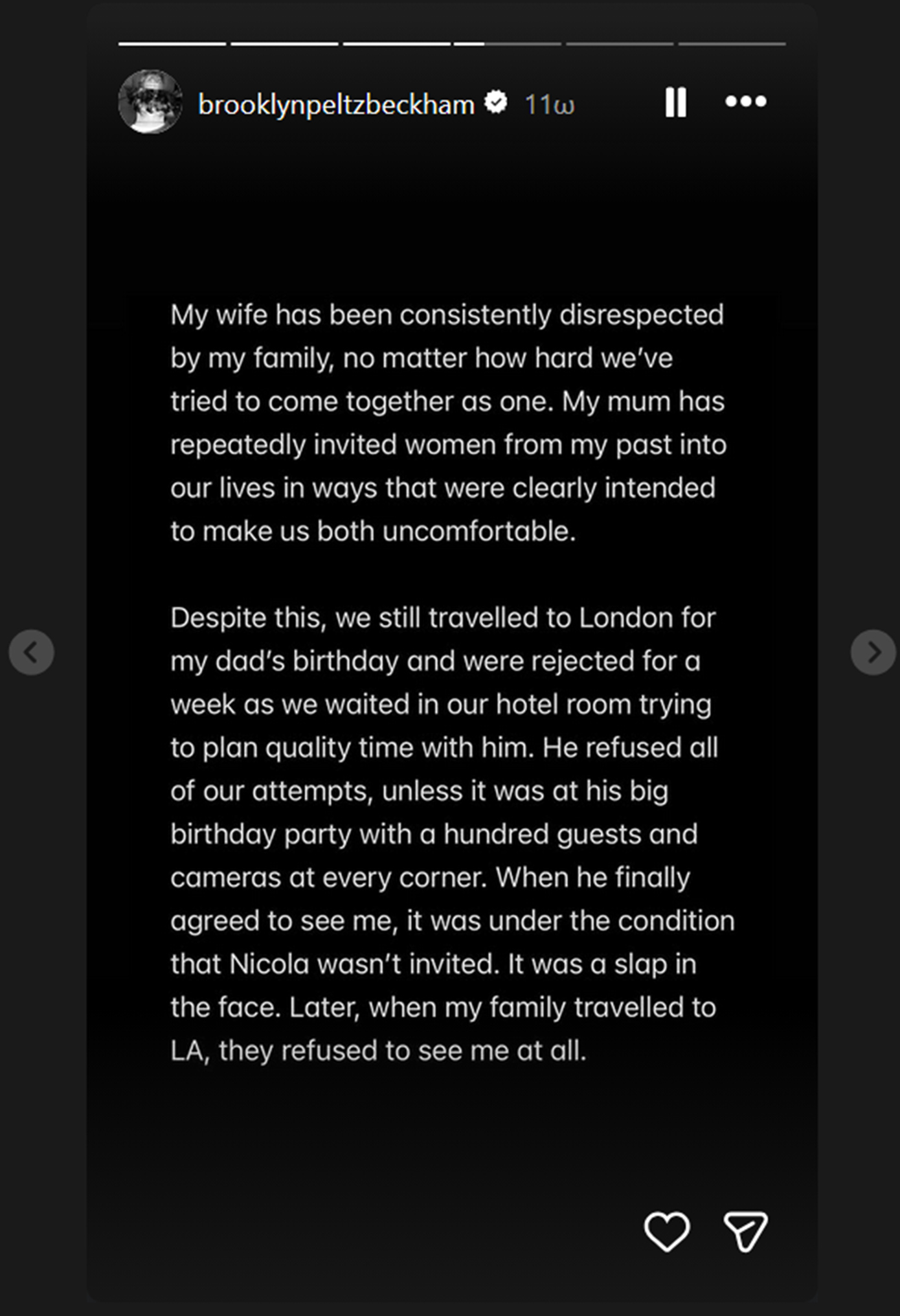 «Έχω μείνει σιωπηλός για χρόνια και έκανα κάθε δυνατή προσπάθεια να κρατήσω αυτά τα ζητήματα ιδιωτικά. Δυστυχώς, οι γονείς μου και η ομάδα τους συνέχισαν να απευθύνονται στον Τύπο, αφήνοντάς μου καμία άλλη επιλογή από το να μιλήσω ο ίδιος και να πω την αλήθεια για μερικά μόνο από τα ψέματα που έχουν δημοσιευτεί», έγραψε ο 26χρονος γιος του Ντέιβιντ Μπέκαμ.