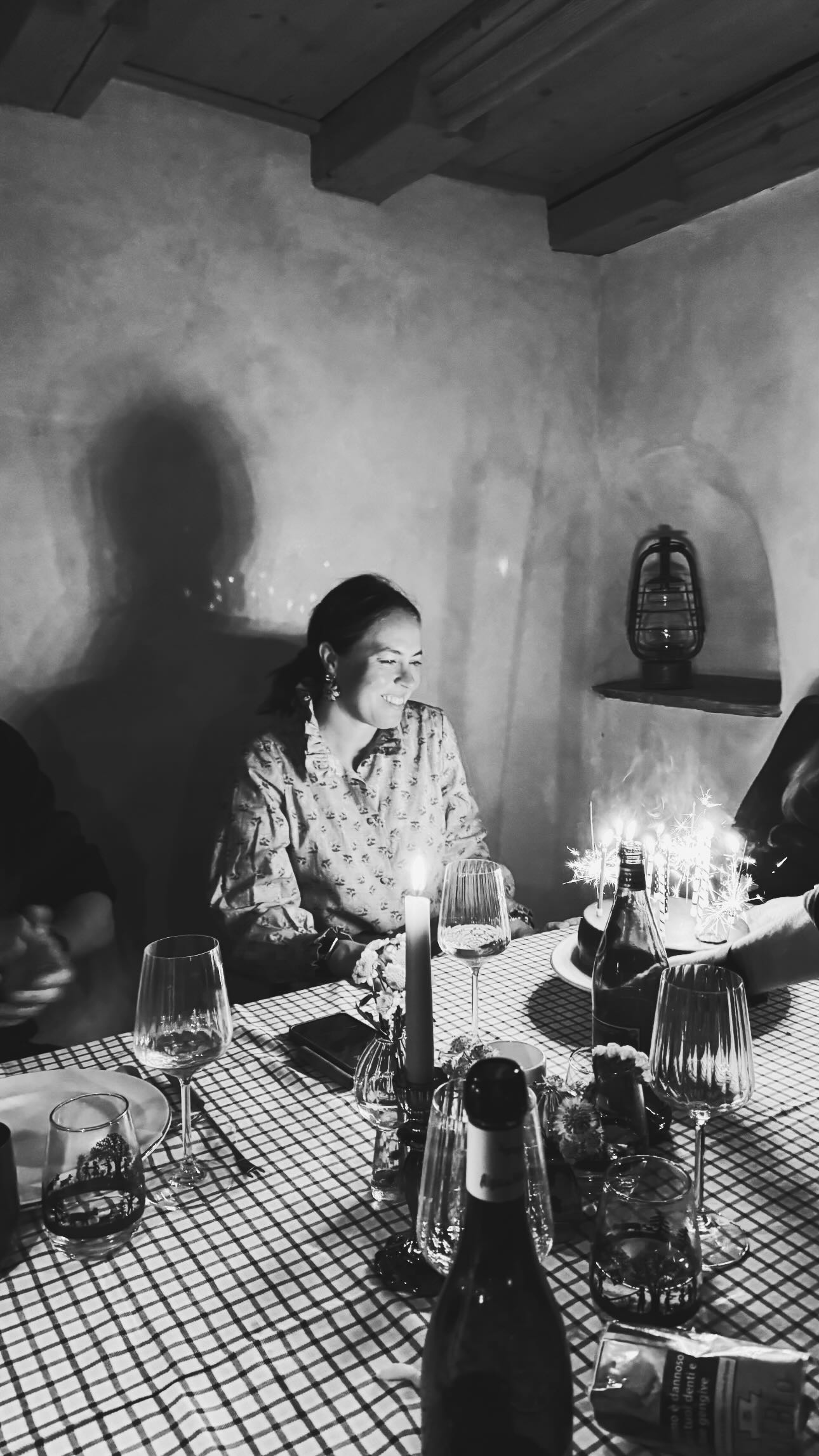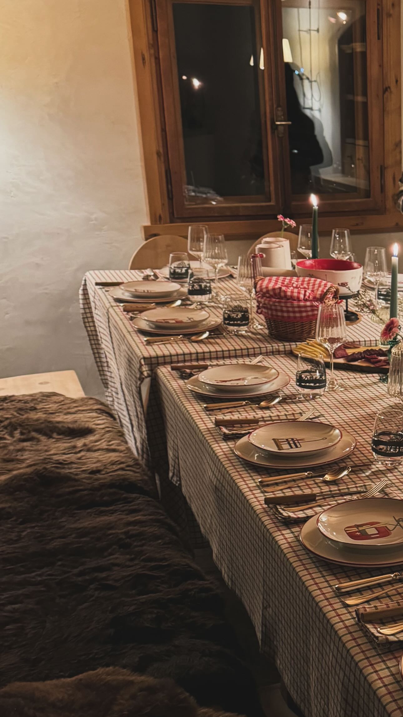 Το εορταστικό δείπνο παρατέθηκε σε ένα παραδοσιακό εστιατόριο με ξύλινη επένδυση, όπου το τραπέζι ήταν στρωμένο με το κλασικό καρό τραπεζομάντιλο, δημιουργώντας μια οικεία και χαλαρή αίσθηση.