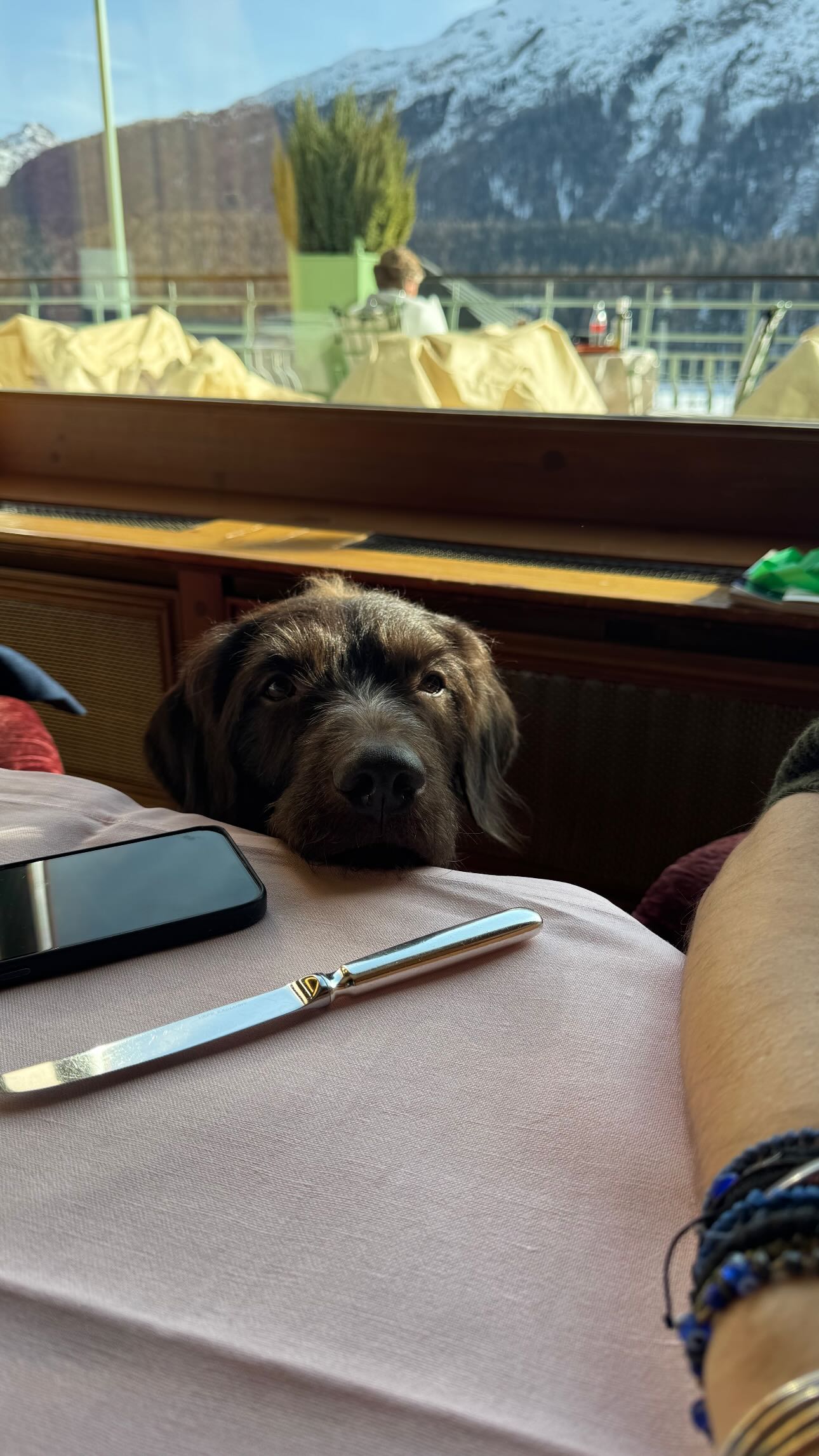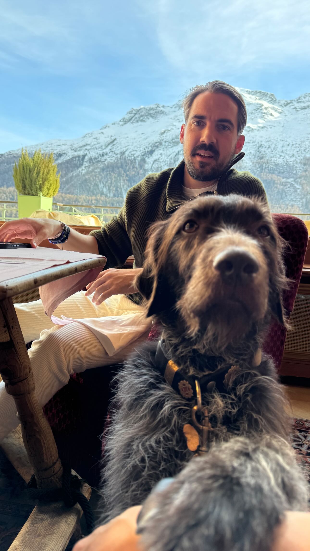 Από τις φωτογραφίες δεν έλειπε ο αγαπημένος τους σκύλος, ο οποίος τους συνόδευε παντού, ακόμα και στο εστιατόριο με την πανοραμική θέα στα βουνά, όπου το ζευγάρι απόλαυσε ένα ήσυχο γεύμα κάτω από τον λαμπερό ήλιο.