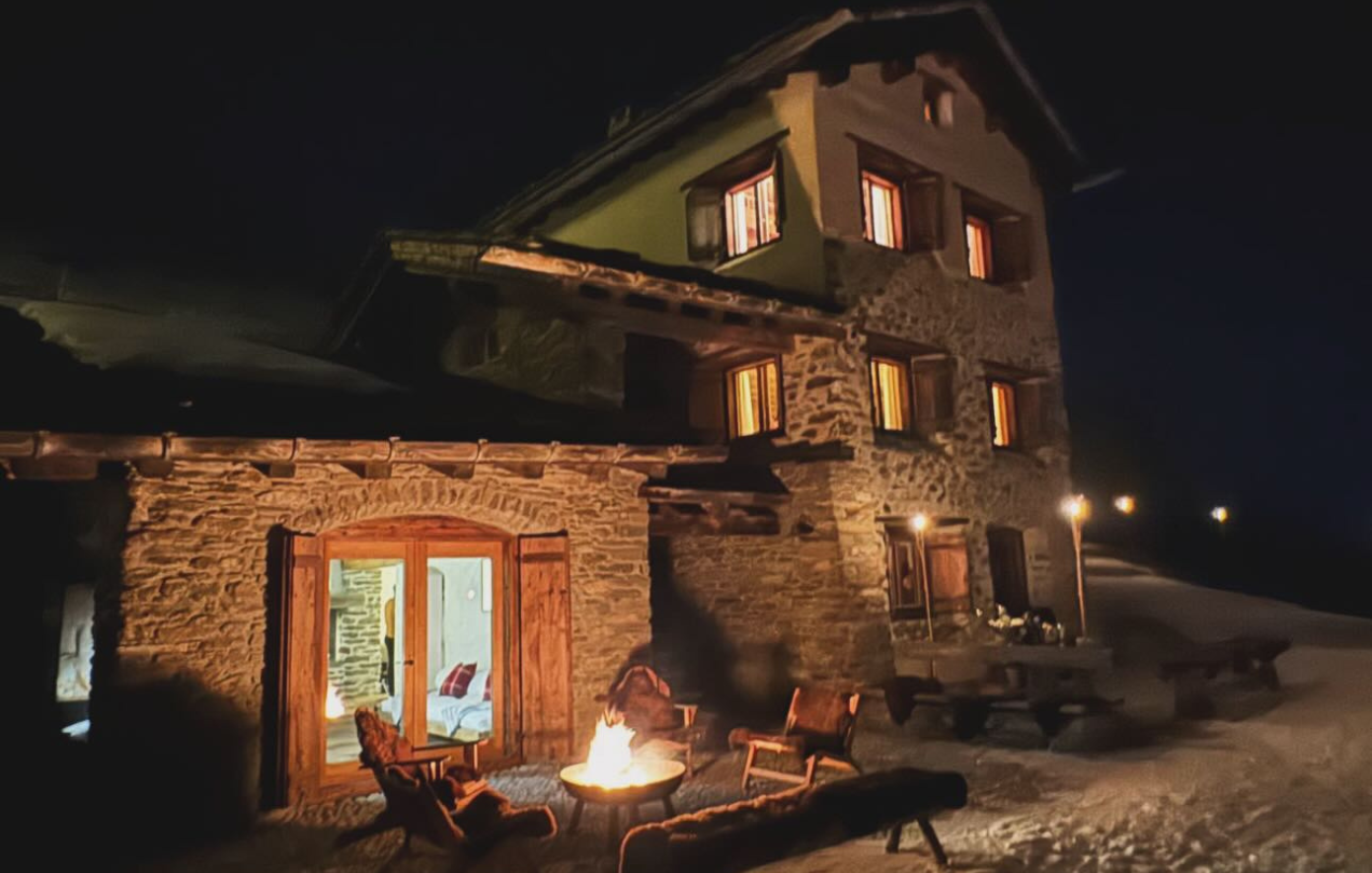 Οι φωτογραφίες αποκαλύπτουν ένα εντυπωσιακό πέτρινο σαλέ, φωτισμένο ζεστά μέσα στην καρδιά της νύχτας, περιτριγυρισμένο από πυκνό χιόνι.