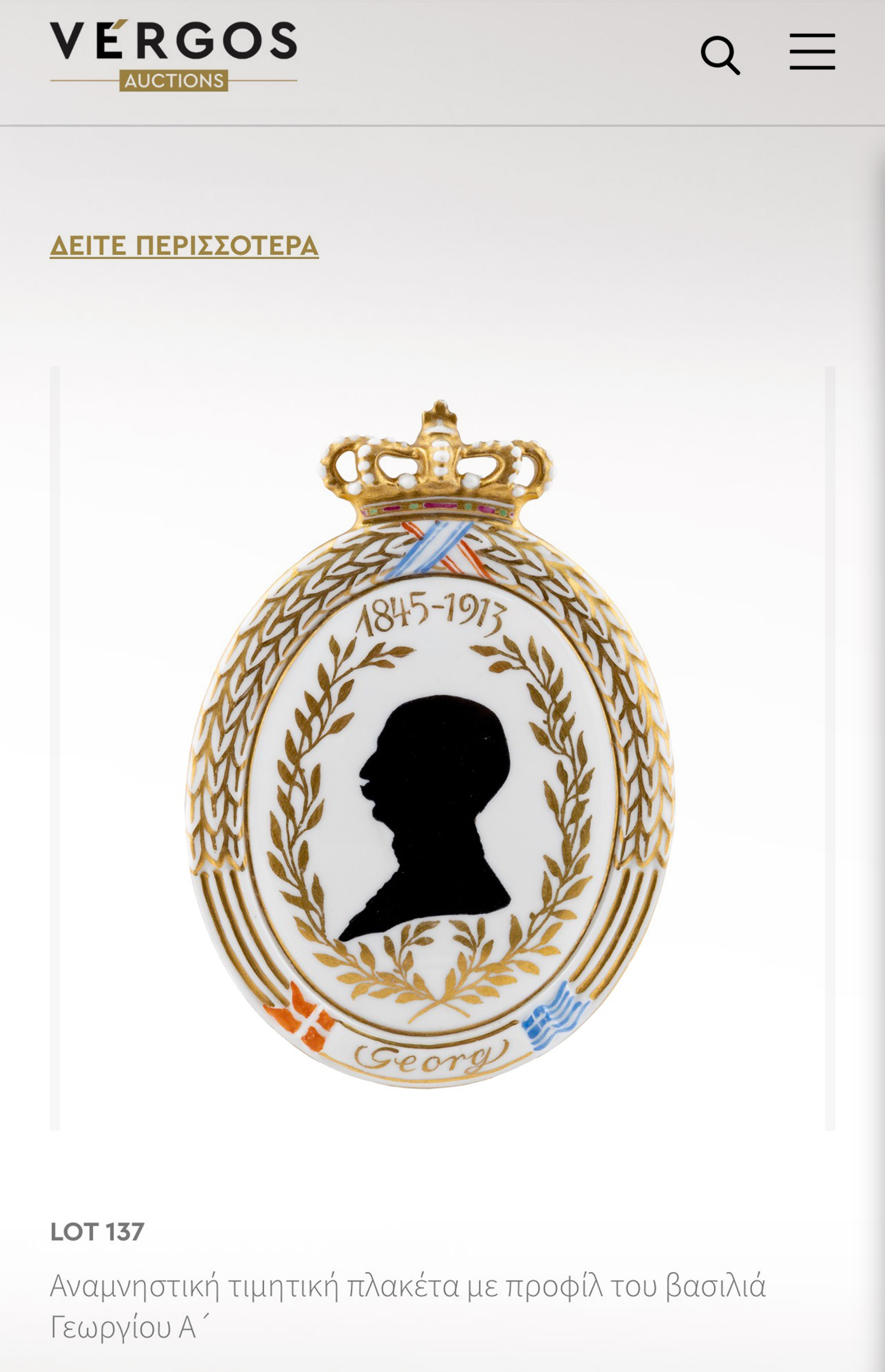 Ανάμεσα στα εξαιρετικά lot της δημοπρασίας συγκαταλέγονται ακόμη μια αναμνηστική πλακέτα με προφίλ του βασιλιά Γεωργίου του Α’ όπως και τρεις σφραγίδες του Δημητρίου Λ. Κουντουριώτη, καθώς και επάργυρα σκεύη των αρχών του 20ου αιώνα με την υπογραφή του Οίκου Fratelli Broggi που φέρουν εγχάρακτα κάτω από το στέμμα τα αρχικά του Βασιλικού Ναυτικού και σε ταινία «Γ. Αβέρωφ».