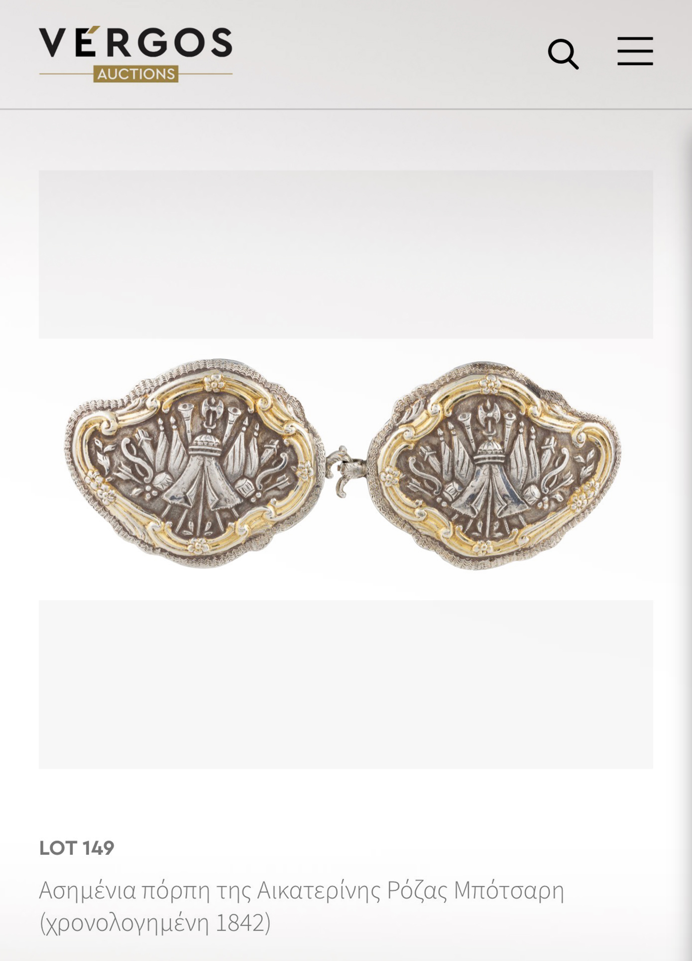 Ένα από τα ωραιότερα δημοπρατούμενα είδη είναι επίσης η ασημένια πόρπη της Αικατερίνης Ρόζας Μπότσαρη, κόρης του Σουλιώτη αγωνιστή Μάρκου Μπότσαρη και συζύγου του στρατηγού Γεώργιου Καρατζά, που διετέλεσε κυρία επί των τιμών της βασίλισσας Αμαλίας.